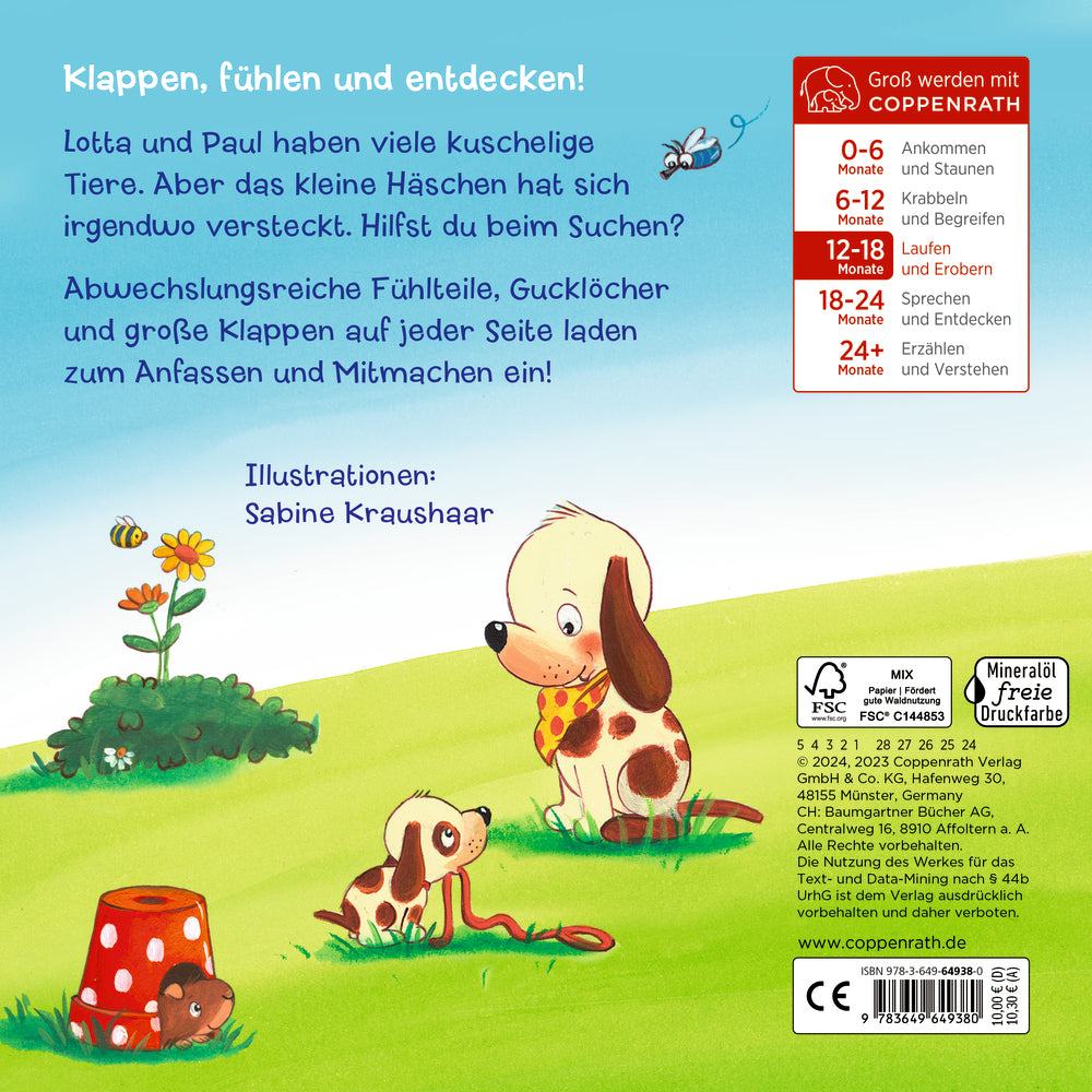 Dieses Fühlbuch lädt mit hochwertigen Fühlelementen hinter großen, stabilen Klappen schon die Kleinsten zum Anfassen und Mitmachen ein. Wo ist der kleine Hase? Paul und Lotta suchen im Park, am Teich, im Haus und im Garten - wer hilft mit beim Suchen? Tolle Kombination aus Gucklöchern, Klappen und Fühlelementen zum Mitraten. Ideal für kleine Hände. Coppenrath Kinder Aus der Reihe: Fühlen und die Welt begreifen ab 12 Monate Seiten: 10 Format: 18,5 x 18,5 cm Pappe Einband: mit Spotlack und Fühlelement Ausstattung: mit Pappklappen, Filzklappe und Fühlelementen