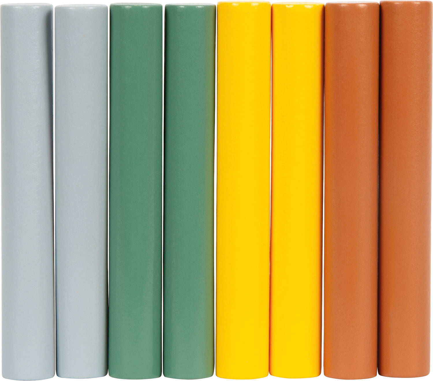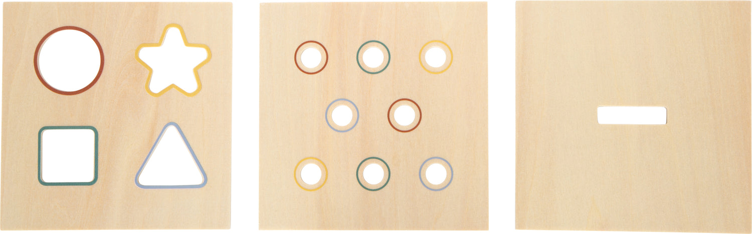 Inhalt: Sortierbox mit 3 austauschbaren Deckeln, 4 Holz-Münzen, 8 Stäbe und 4 Bauklötze in verschiedenen Formen- klare, farbenfrohe Gestaltung