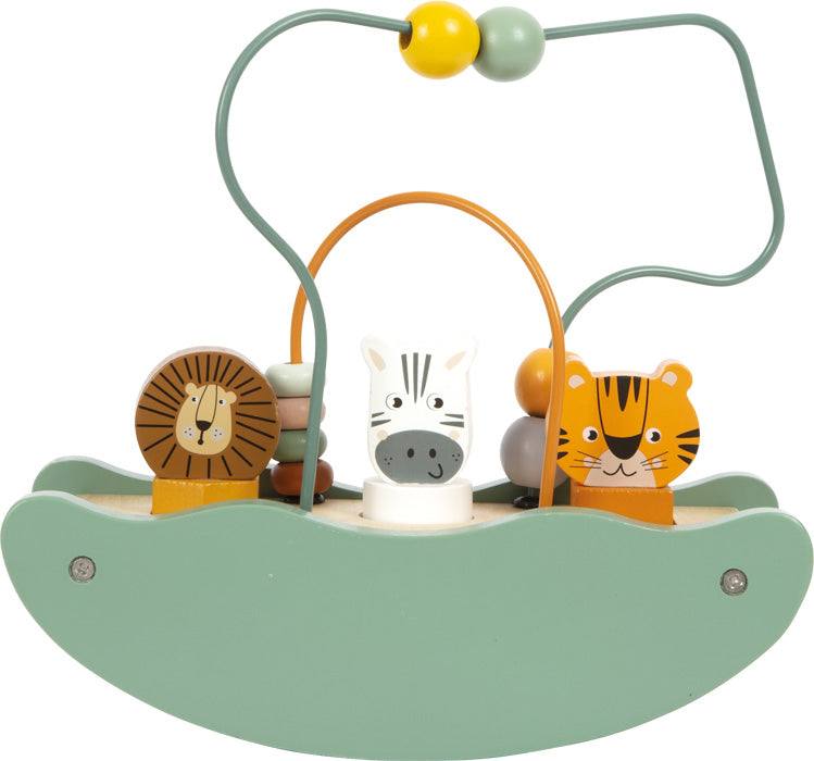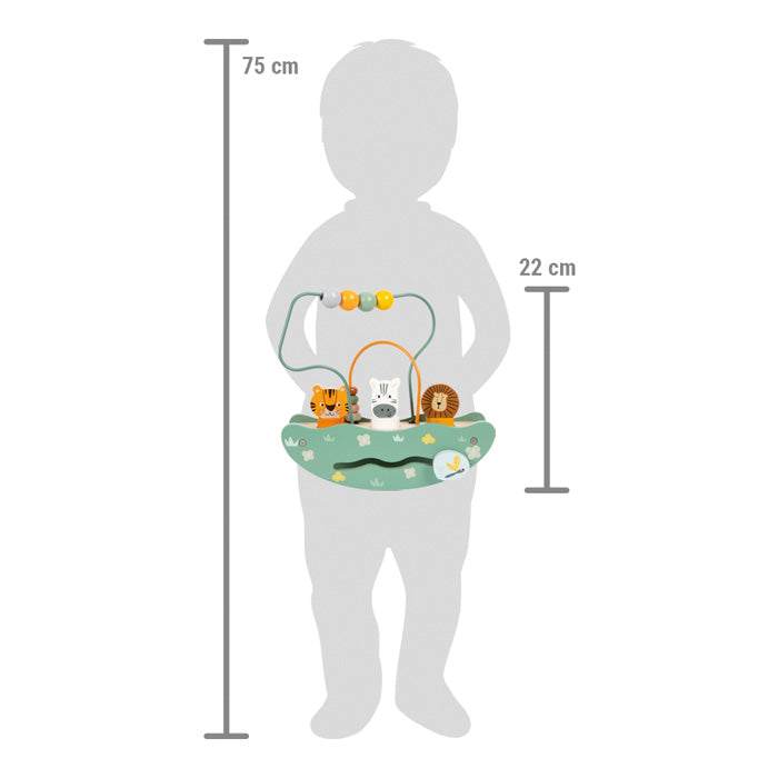 Entdecken, spielen & lernen – all das bietet dieses vielseitige Motorikspielzeug im Safari-Look aus robustem Holz von small foot, das zwei Motorikschleifen mit einem Schiebe- und Formensteckspiel sowie einer Wippe kombiniert. Die Motorikschleifen sind mit je vier Perlen in zwei verschiedenen Größen ausgestattet. Hier können kleine Entdecker ihre feinmotorischen Fähigkeiten trainieren. Geschicklichkeit und Hand-Augen-Koordination wird zusätzlich durch das Formensteckspiel mit den drei niedlichen Tierfiguren geschult, wenn sie in die zu ihnen passenden Öffnungen gesteckt werden. Für den extra Spaß und Geschicklichkeitstraining sorgt das integrierte Schiebespiel und die Wippfunktion. Da ist langanhaltender Spiel- und Lernspaß garantiert! Die liebevolle und detailreiche Gestaltung, der hochwertige Druck und die moderne Farbgebung machen dieses Holzspielzeug mit hohem sichtbaren Holzanteil zu einem echten Hingucker im Kinderzimmer. Ein hochwertiges und pädagogisch wertvolles Lernspielzeug, das die motorische Entwicklung fördert und gleichzeitig eine Quelle der Freude und des Entdeckens ist. Artikel: 12459 Maße: 24 x 9 x 22 cm Altersempfehlung: ab 12 Monate