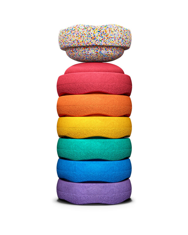 Das Stapelstein Special Original Mini rainbow classic Set enthält sechs Stapelstein Original Mini in den Farben violett, blau, grün, gelb, orange, rot und gratis dazu super Konfetti
