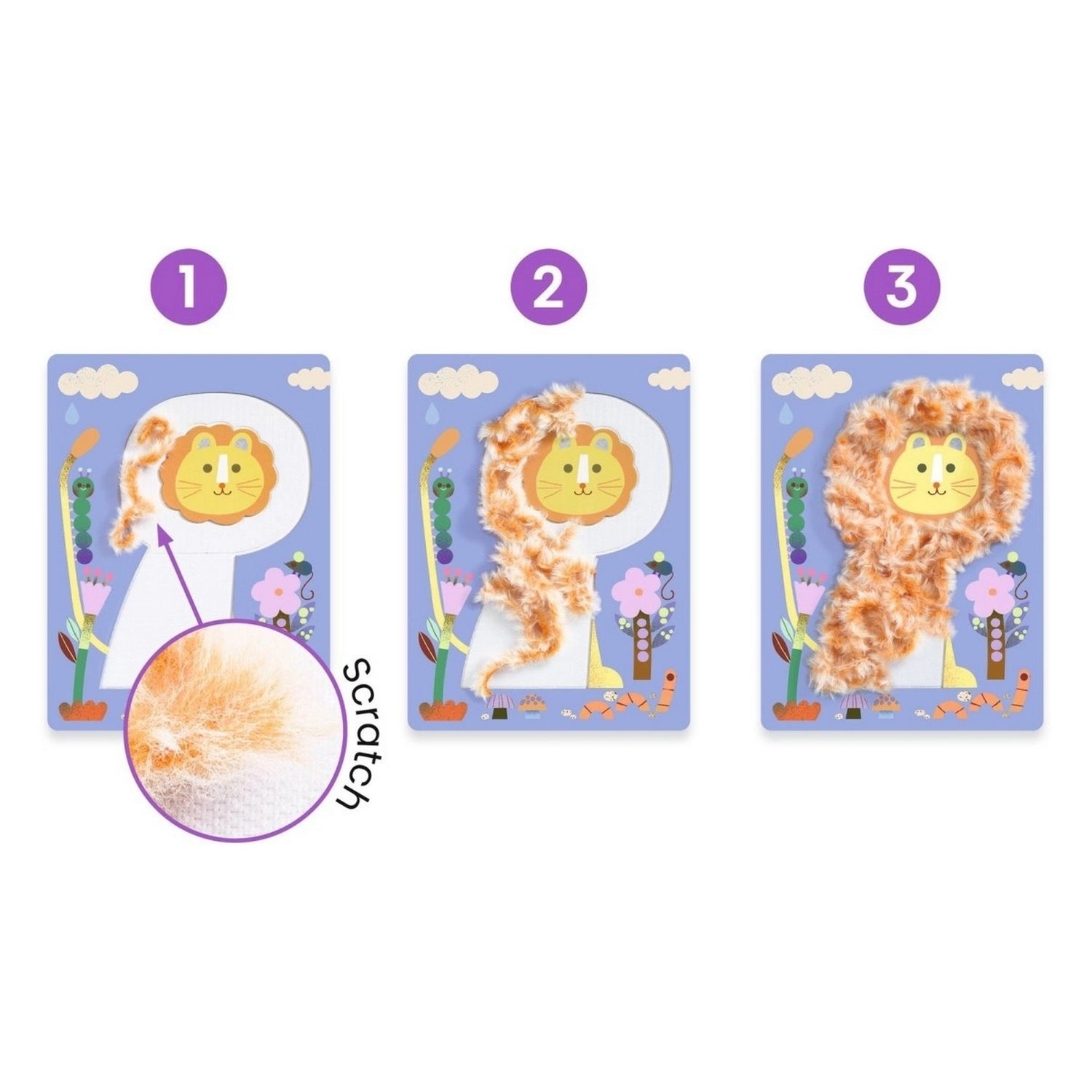 Die Klettzonen auf den 4 Bögen erleichtern das Zusammenfügen der Wollfäden und ermöglichen es den Kindern, ihre eigenen kleinen Kunstwerke zu schaffen.