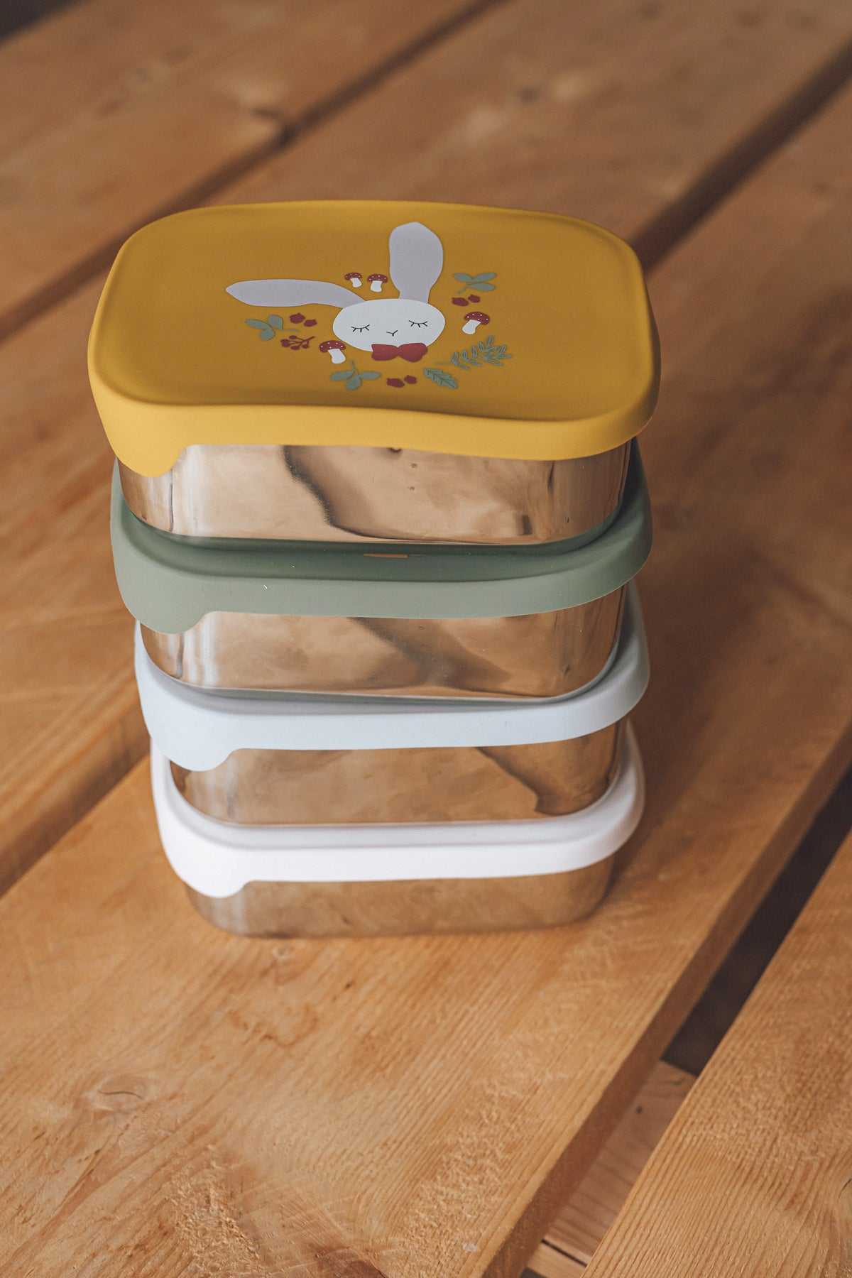 Die Brotdosen sind mit unterschiedlich gestalteten Silikondeckeln erhältlich. Jedes Design gibt es auch als Trinkflasche, Schale, Lätzchen und Platzset.
