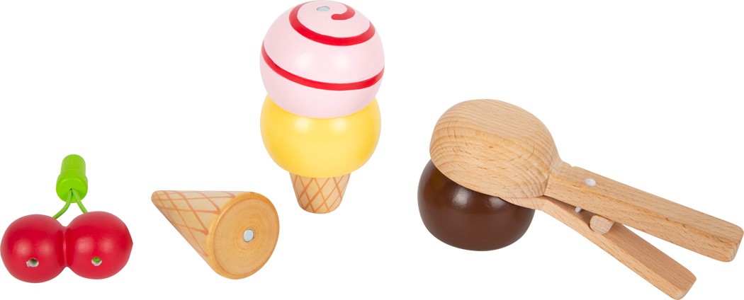 Die insgesamt 21 Teile bestehen unter anderem aus: Acht verschiedenen Eissorten, Eiswaffeln, Eisbecher, Löffel, Deko- Kirsche, Herzchen Waffeln und vieles mehr....