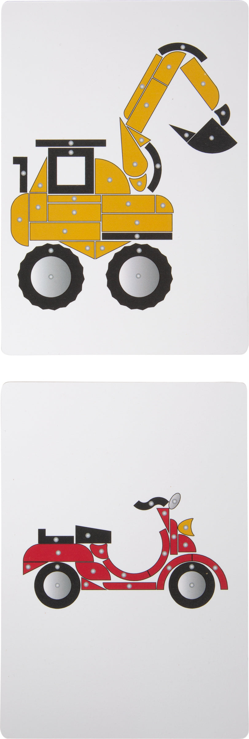 Als Unterstützung für den Anfang, werden acht Bildvorlagen mitgeliefert. In diesem Hämmerchen Spiel lassen sich Fahrzeuge und und deren Figuren erschaffen.
