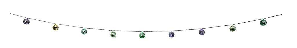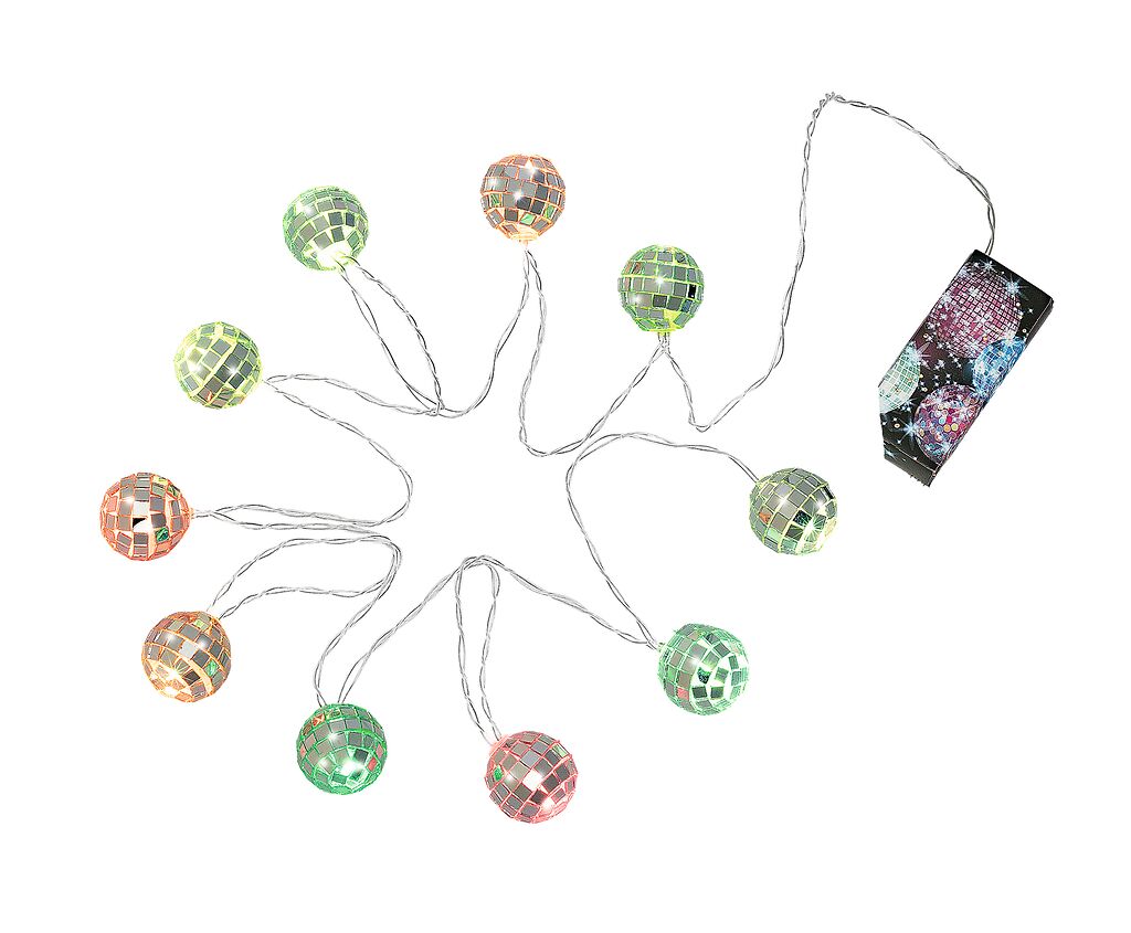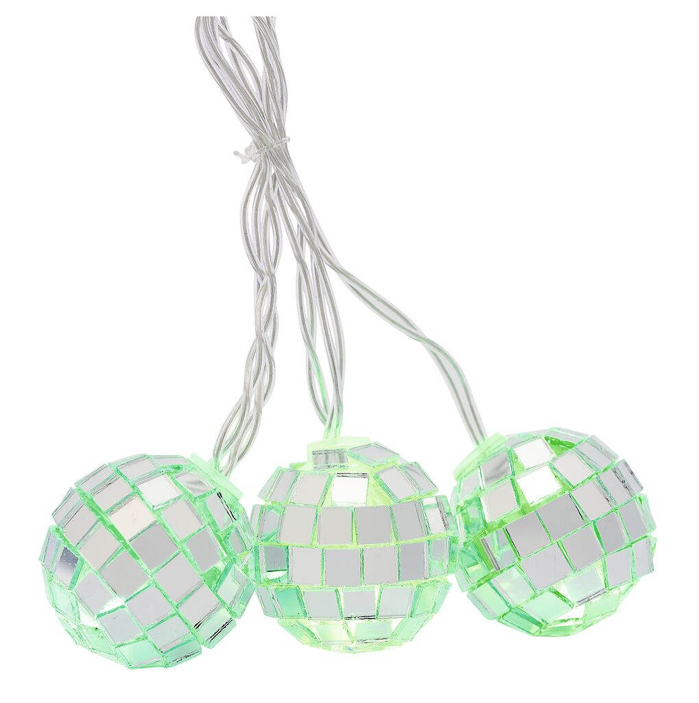 Die Lichterkette Discokugel eignet sich perfekt für den Innenbereich und ist ideal für Wohnzimmer, Partys oder als ausgefallene Dekoration. Die insgesamt 1,75 Meter lange Kette besteht aus 10 Discokugeln mit einem Durchmesser von ca. 3 cm. Die benötigten Batterien (2 x AA) sind nicht im Lieferumfang enthalten.