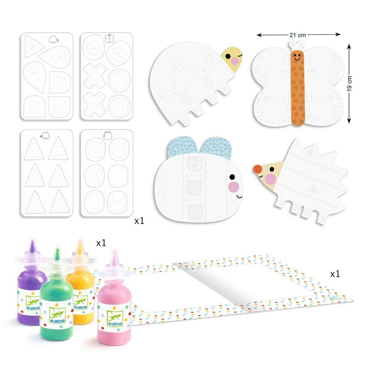 Inhalt: 4 Silhouettenbögen zum Malen, 4 Bögen mit selbstklebenden kleinen Formen zum Abziehen und Bemalen, 1 Tischschutz aus Papier und eine bebilderte Anleitung.