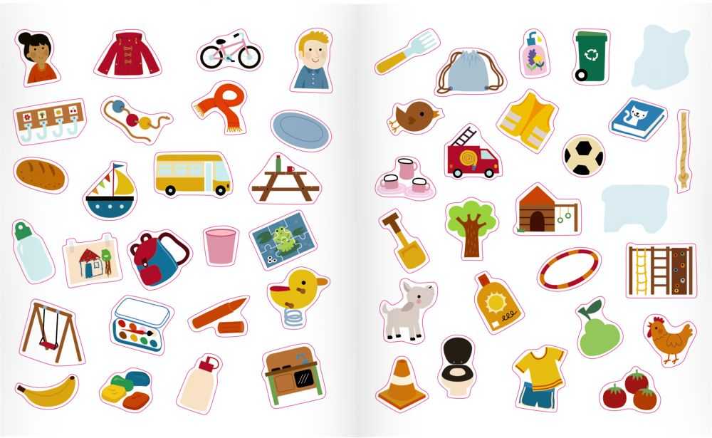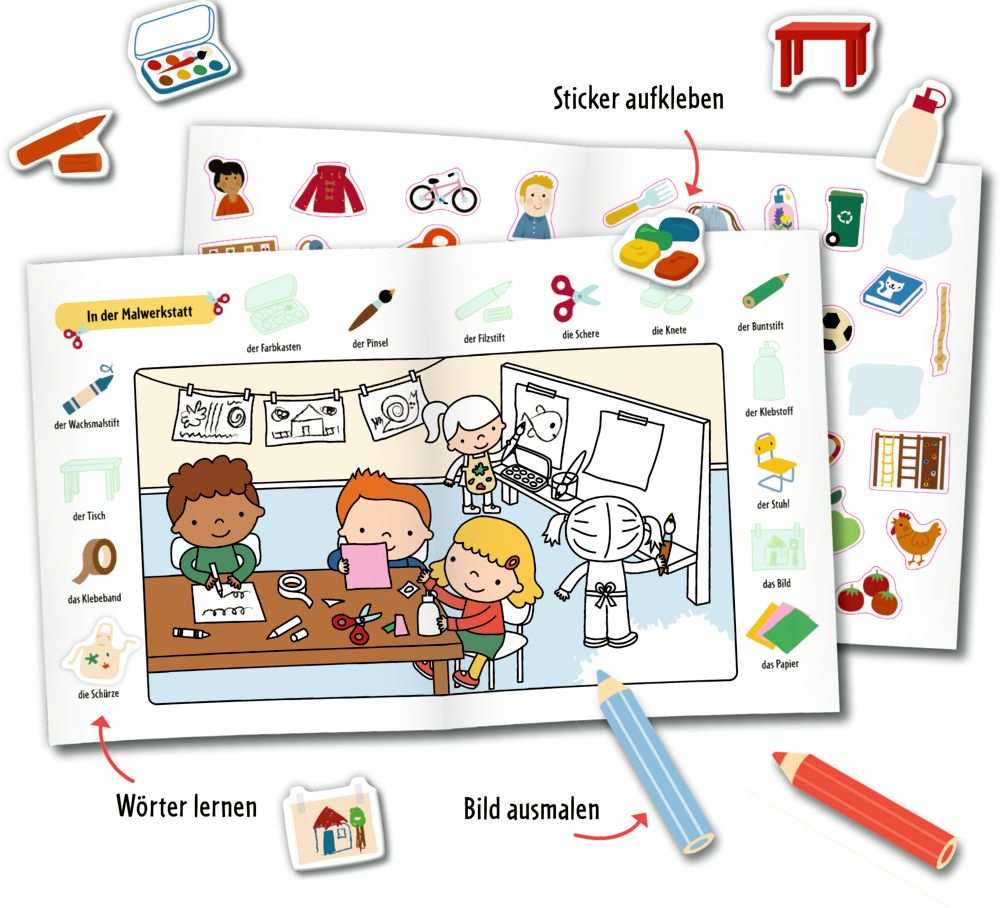 fröhliche Bilder mit Kindergartenmotiven ausmalen und lustige Sticker einkleben.