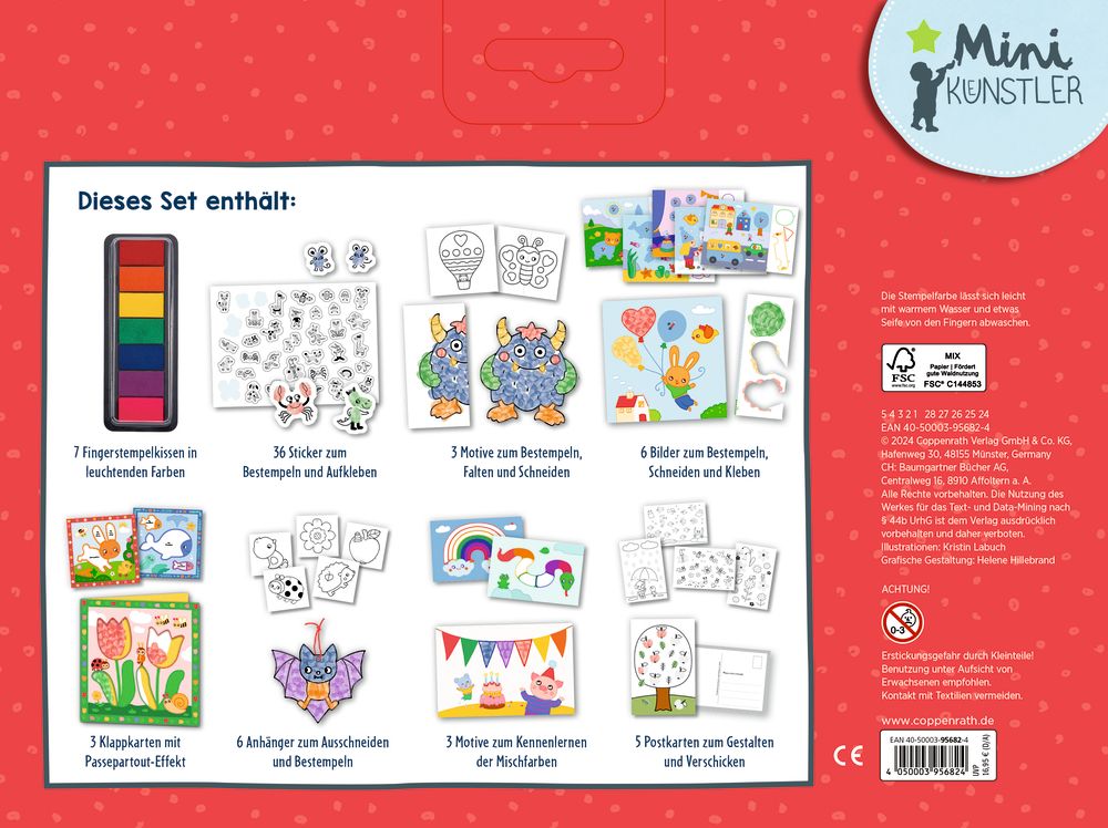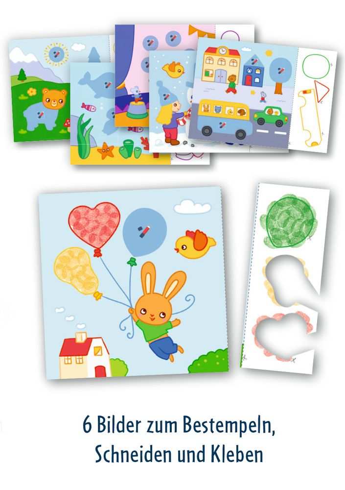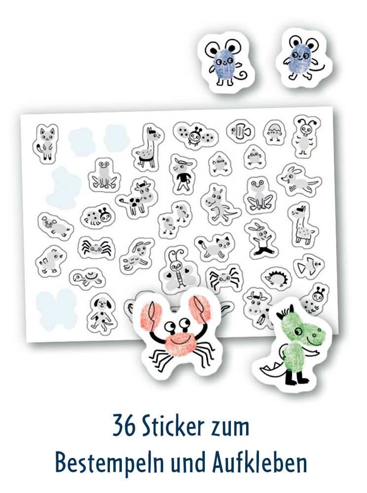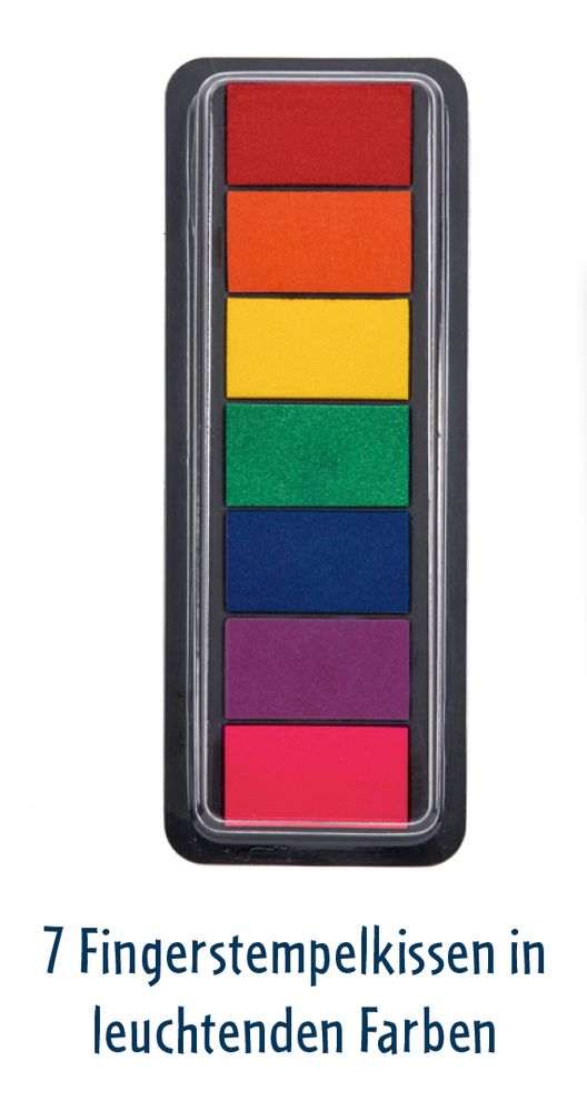 Dieses große Bastelset für Kindergartenkinder enthält 7 Fingerstempelfarben, 36 Sticker zum Bestempeln und Aufkleben,