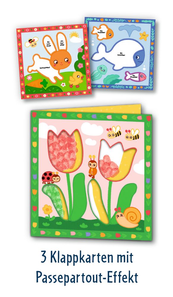 3 Motive zum Bestempeln, Falten und Schneiden, 6 Bilder zum Bestempeln, Schneiden und Kleben, 3 Klappkarten mit Passepartout-Effekt,