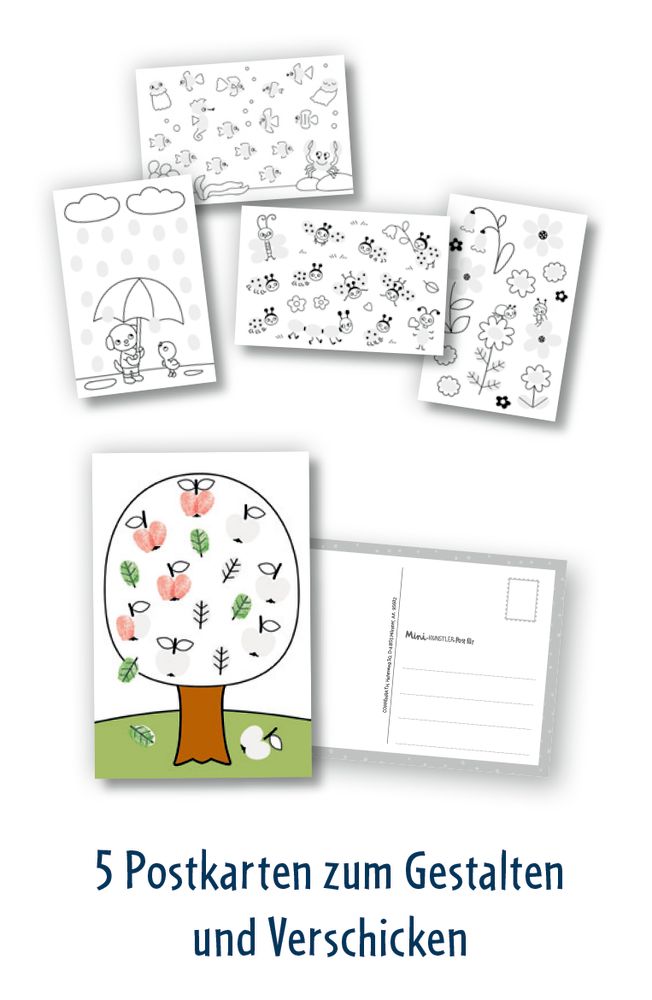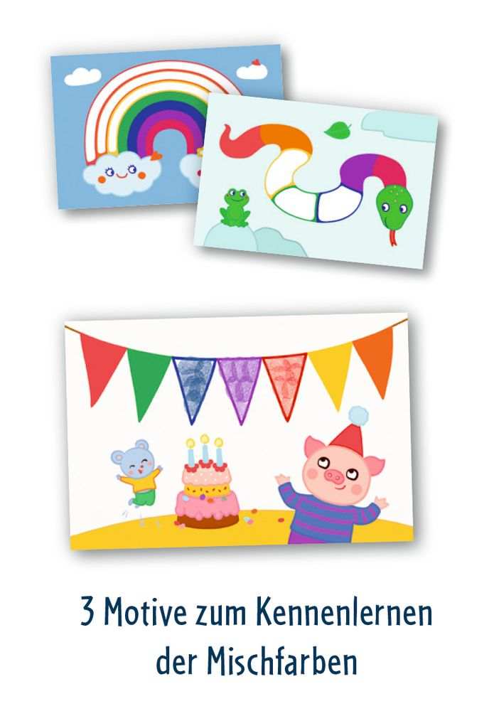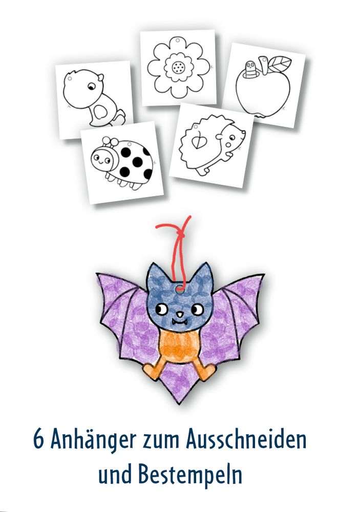 6 Anhänger zum Ausschneiden und Bestempeln, 3 Motive zum Kennenlernen der Mischfarben und 5 Postkarten zum Gestalten und Verschicken.