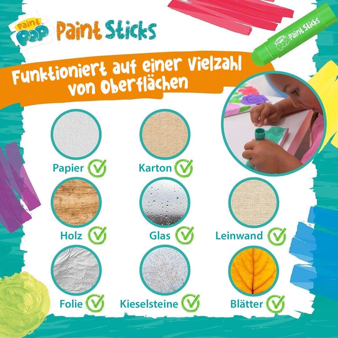 Diese Malstifte bieten ein unvergleichliches Malerlebnis - perfekt geeignet für Kinder UND Erwachsene! Mit den Paint Pop Paint Sticks wird jede kreative Idee zur Realität! Entdecke die grenzenlosen Möglichkeiten des Malens und lasse deiner Fantasie freien Lauf – ganz ohne Chaos und komplizierte Vorbereitung. Perfekt für Künstler jeden Alters, die Freude am kreativen Gestalten haben! Die Paint Pop Paint Sticks gleiten mühelos über Papier, Karton, Holz und andere Oberflächen - gleichmäßige, deckende Farbabgabe ohne lästiges Klecksen oder Verschmieren. Die Farbe trocknet in Sekundenschnell - sofortige Ergebnisse ohne verschmieren. Sie sind frei von schädlichen Chemikalien, hautfreundlich und sicher für Kinder. Sie sind CE-zertifiziert und entsprechen den höchsten Sicherheitsstandards. Ideal für Schule, Zuhause oder unterwegs. Perfekt geeignet für Malprojekte, Bastelarbeiten und vieles mehr. Die kompakte Größe und die einfache Handhabung machen sie zum idealen Begleiter für jede kreative Idee. Im Gegensatz zu herkömmlichen Farben sind Paint Pop Paint Sticks sauber in der Anwendung. Keine Pinsel, kein Wasser, keine Flecken – einfach die Kappe abnehmen und loslegen. Altersempfehlung: 3+ Jahren Inhalt: 12 x Paint Pop Paint Sticks inkl. Ideen Broschüre