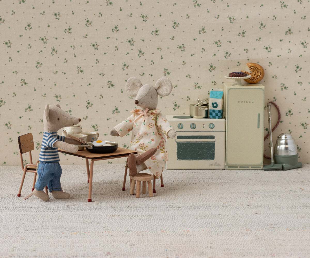 Mit der Tisch- und Stuhlgarnitur von Maileg können Kinder ihrer Kreativität freien Lauf lassen und spannende Geschichten rund um das Mausloch Bauernhaus erleben. Das Set ist nicht nur ein Möbelstück, sondern ein wichtiger Bestandteil für stundenlangen Spielspaß und fantasievolle Abenteuer.