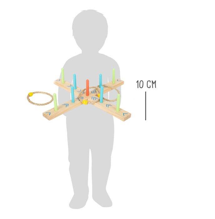 Das Ringwurfspiel von small foot begeistert Groß und Klein. Es trainiert die Hand- Augen- Koordination und die Geschicklichkeit. Dank der farbigen Pins kann die Punktzahl auch ohne Zahlenkenntnisse ermittelt werden, ideal für kleinere Kinder. Das Spiel lässt sich kinderleicht auf- und abbauen. In dem mitgeliefertem Tragebeutel kann es überall mit hingenommen werden. Das Ringwurfspiel ist auch eine sportliche Beschäftigung für die Geburtstagsparty im Garten.