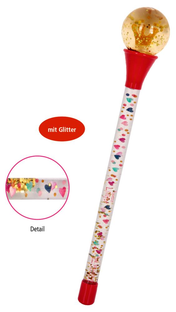 Zauberstab mit farbigen Motiven, irisierenden Glitzerpartikeln und Goldglitte.