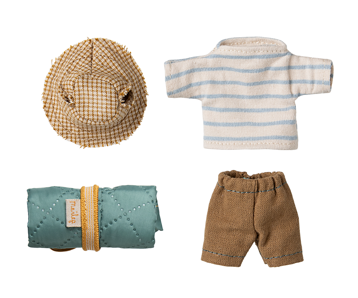 Die Wandermaus, Großer Bruder - Streifen von Maileg, ist das ideale Begleiter für einen Ausflug in die Natur. Diese Maus ist speziell für Spaziergänge ausgestattet und hat sogar einen Schlafsack dabei. Mit Magneten in den Händen kann sie problemlos an metallischen Oberflächen haften, was besonders praktisch ist, wenn man unterwegs ist.