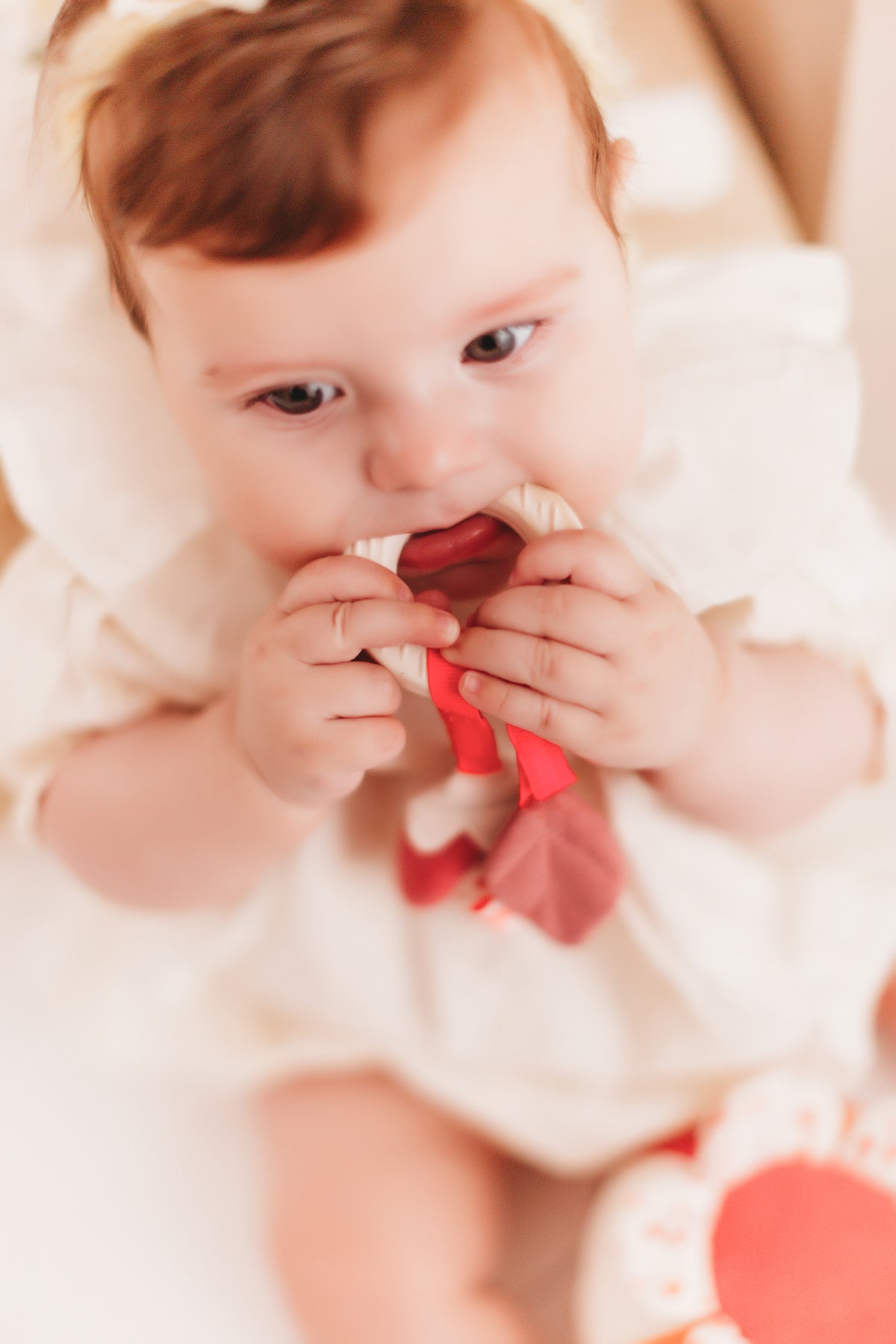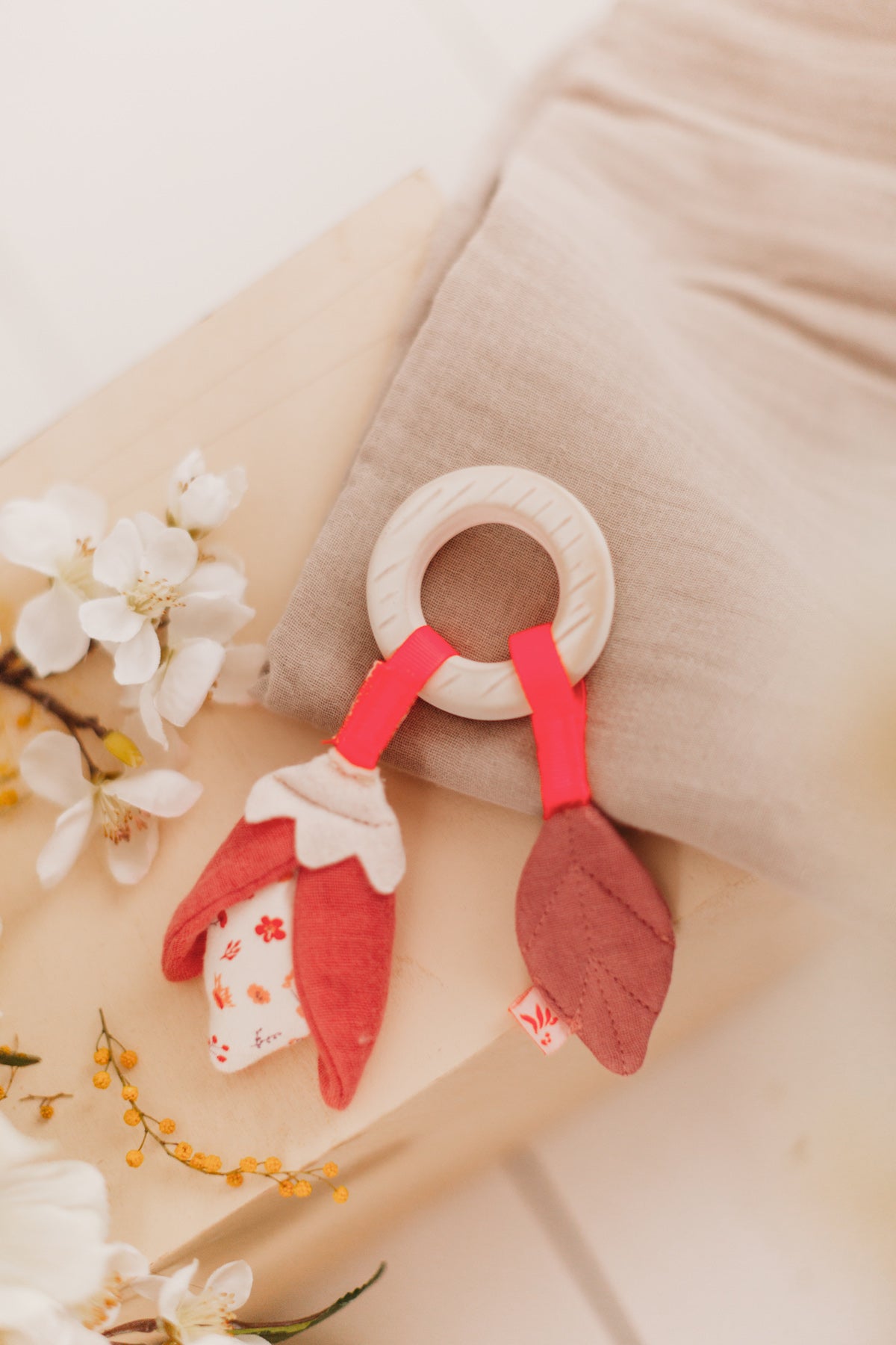Beißring und Unterhaltung für dein Kleines in einem! Um dein Baby während des Zahnens abzulenken, eignet sich dieser Beißring von Kikadu mit den zwei abnehmbaren Mini-Spielelementen aus der der Lamm Kollektion. Den Ring kann dein Baby bedenkenlos in den Mund nehmen und an ihm knabbern. Er ist aus Natur-Kautschuk hergestellt und ist damit absolut sicher für dein Baby. Die zauberhafte Blume und das Blatt unterhalten dein Baby nebenbei mit Knistergeräuschen und werden es von Beschwerden im Mund ablenken. Modell: 2274550 Altersempfehlung: 3 Monate Material: 100% Biobaumwolle und Naturkautschuk Pflege: Handwäsche kalt; Gummi vor dem Waschen entfernen