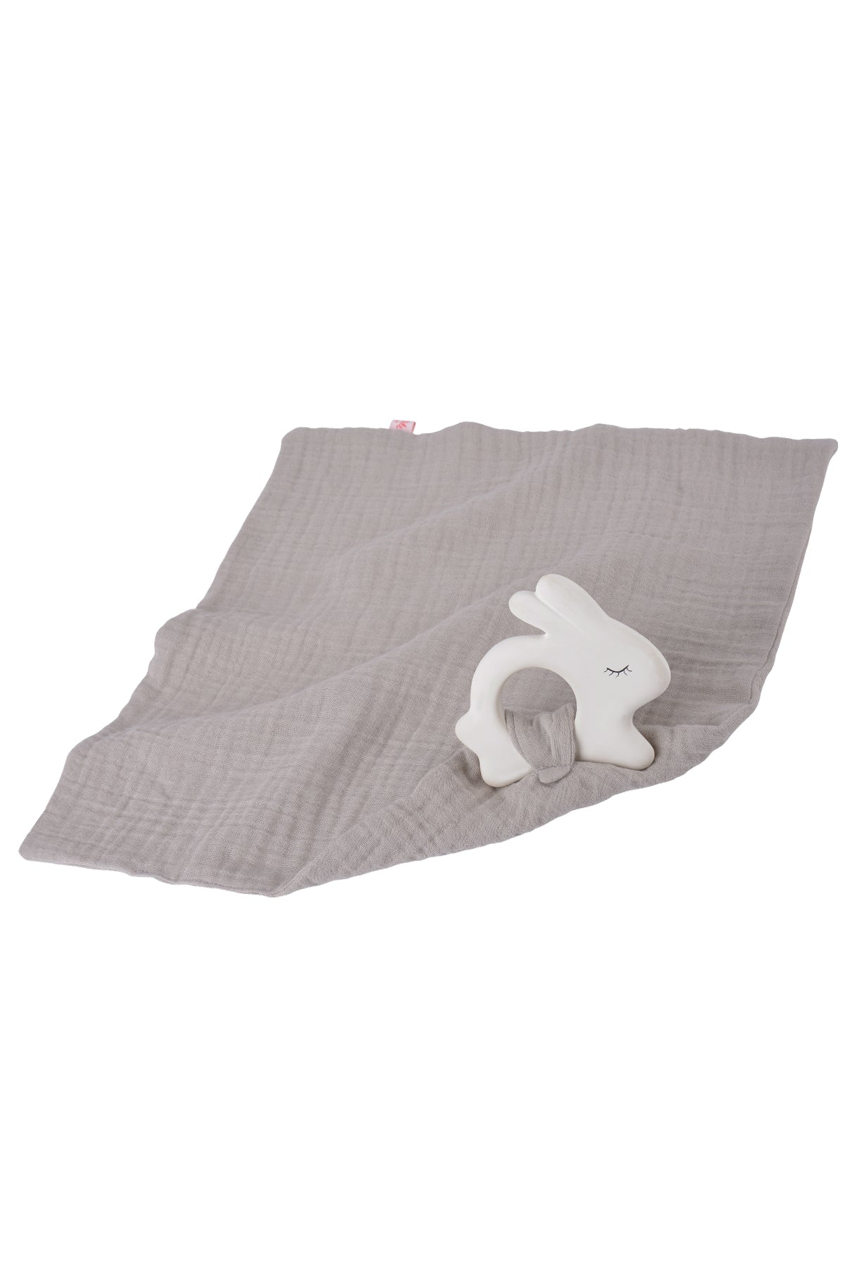 Der Hasen Beißring, von Kikadu, aus Naturkautschuk mit Musselin Tuch hilft beim Zahnen und das Schnuffeltuch hilft Ihrem Kind, schneller in den Schlaf zu finden.