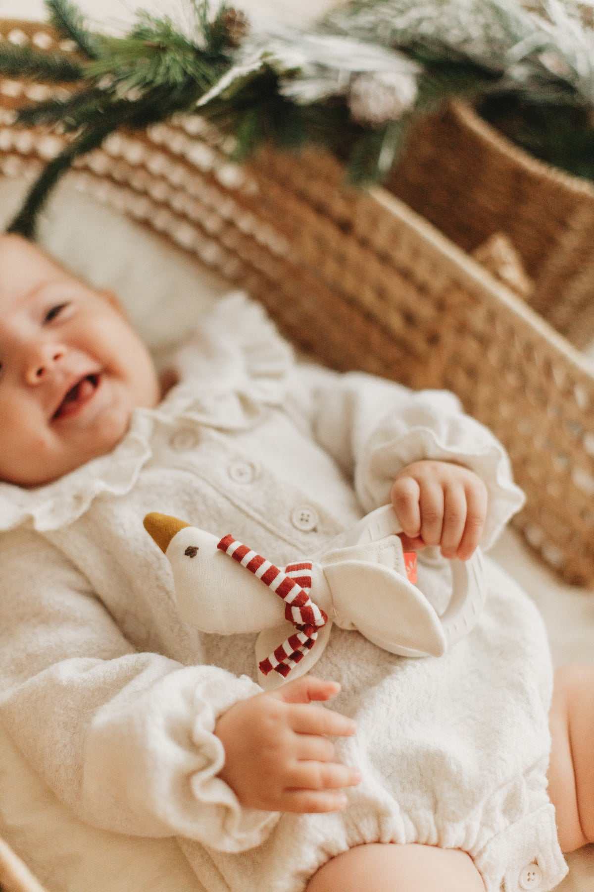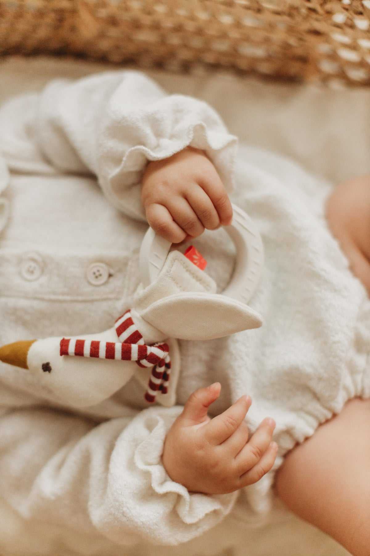 Aber das ist nicht alles! Mit dem abnehmbaren Beißring aus Natur-Kautschuk bietet diese kleine Spielzeug-Gans auch die Möglichkeit, auf spielerische Weise das Zahnfleisch zu erkunden und zu beruhigen.
