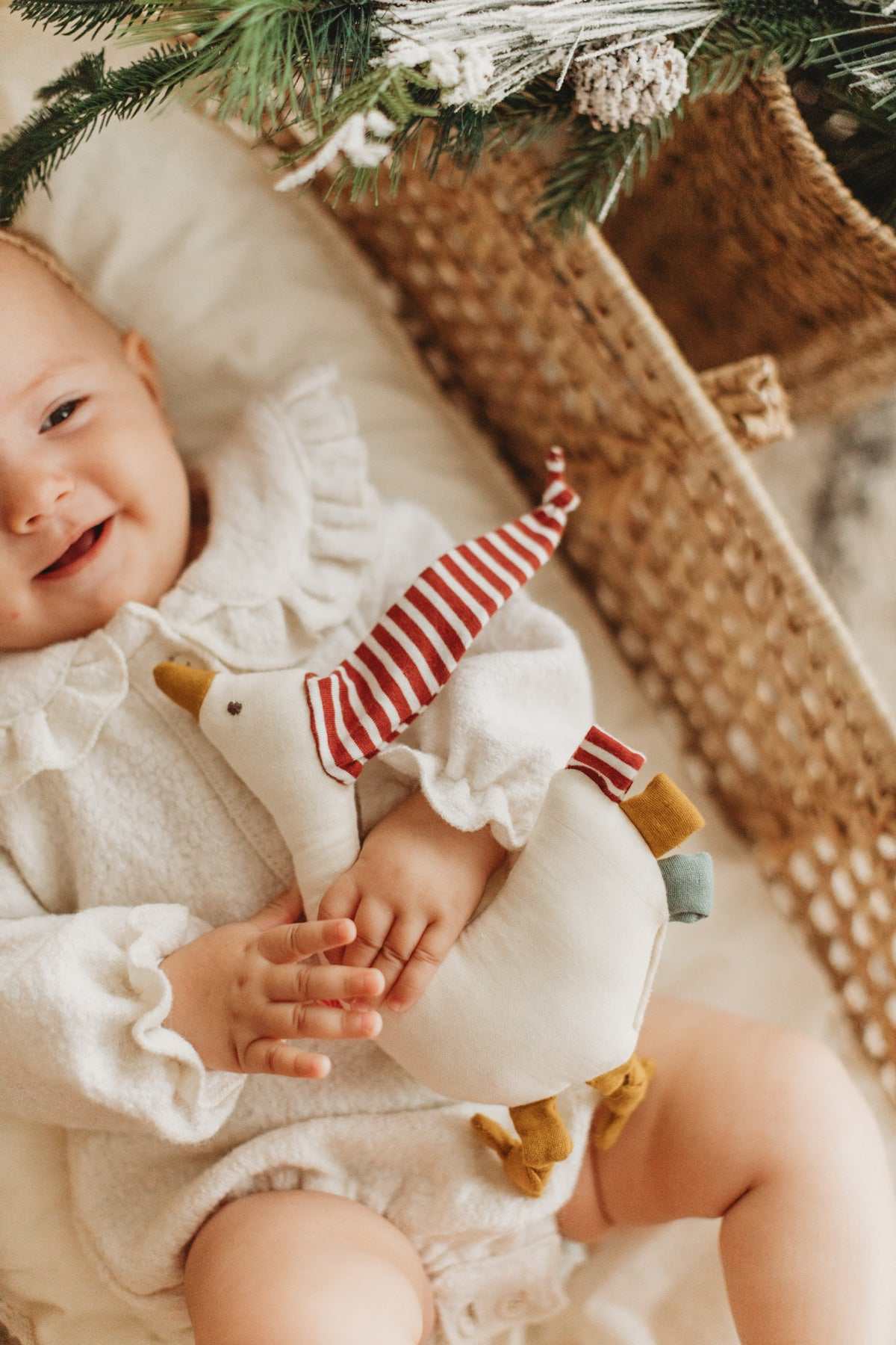 Mit ihrer gestreiften Knister-Schlafmütze bringt sie eine extra Portion Unterhaltung. Schüttelt man die Gans, erklingt eine sanfte Rassel, die kleine Ohren neugierig werden lässt.