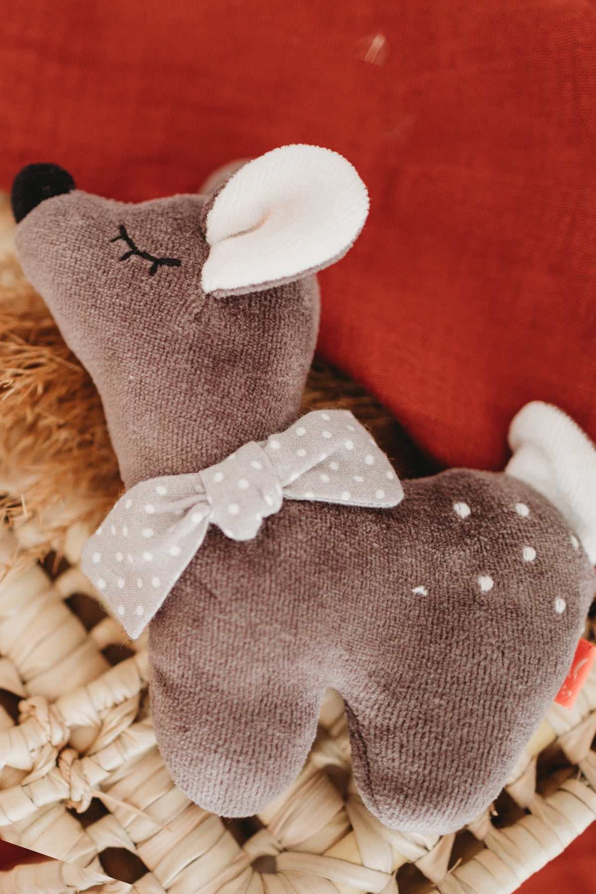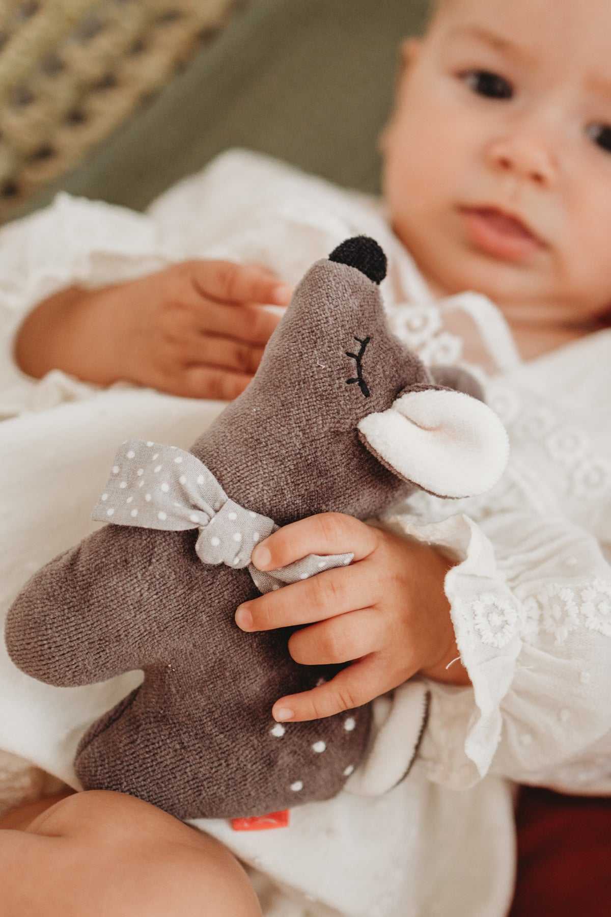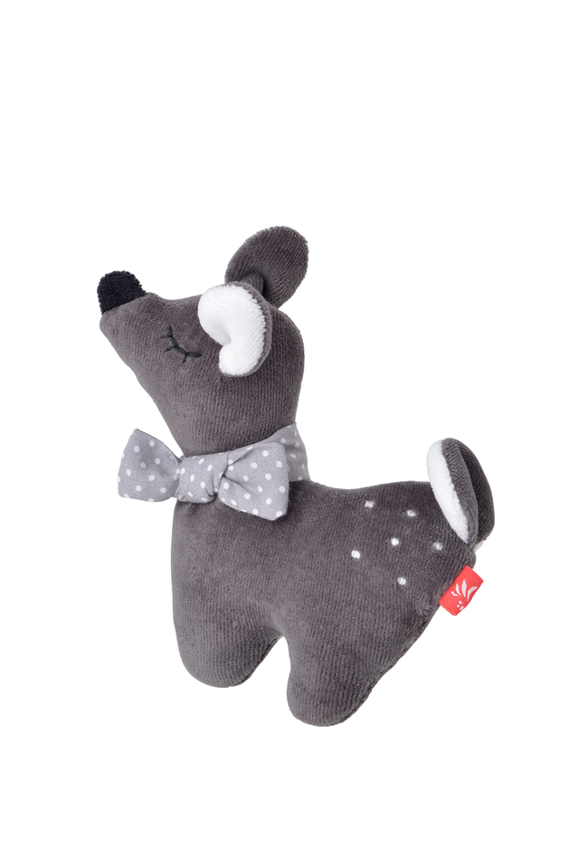Der süße Rehkitz Greifling von Kikadu, verlockt dazu, ihn anzufassen und die Schleife, die Öhrchen sowie den weichen Oberstoff zu entdecken.