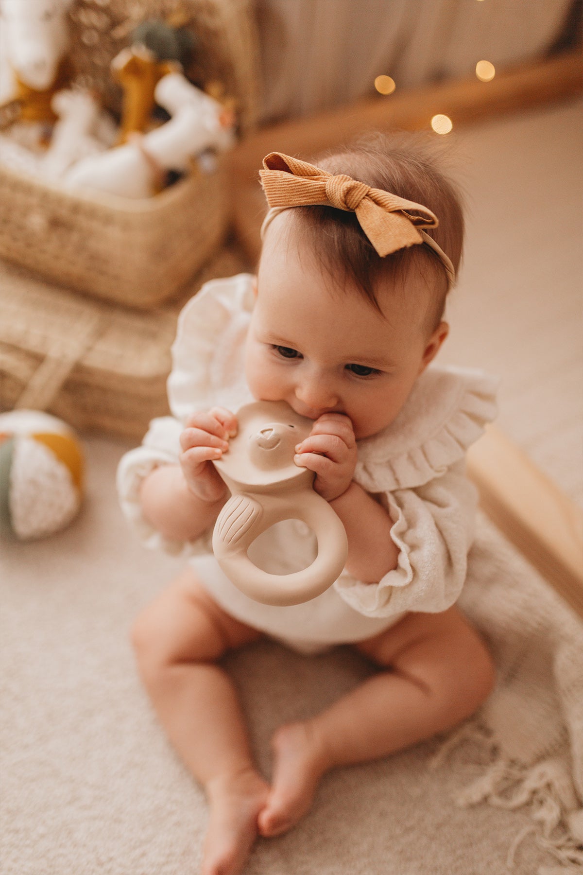 Mit dem Naturkautschuk-Beißring von Kikdadu in Löwenform, kann dein Baby während des Zahnens rumknabbern.
