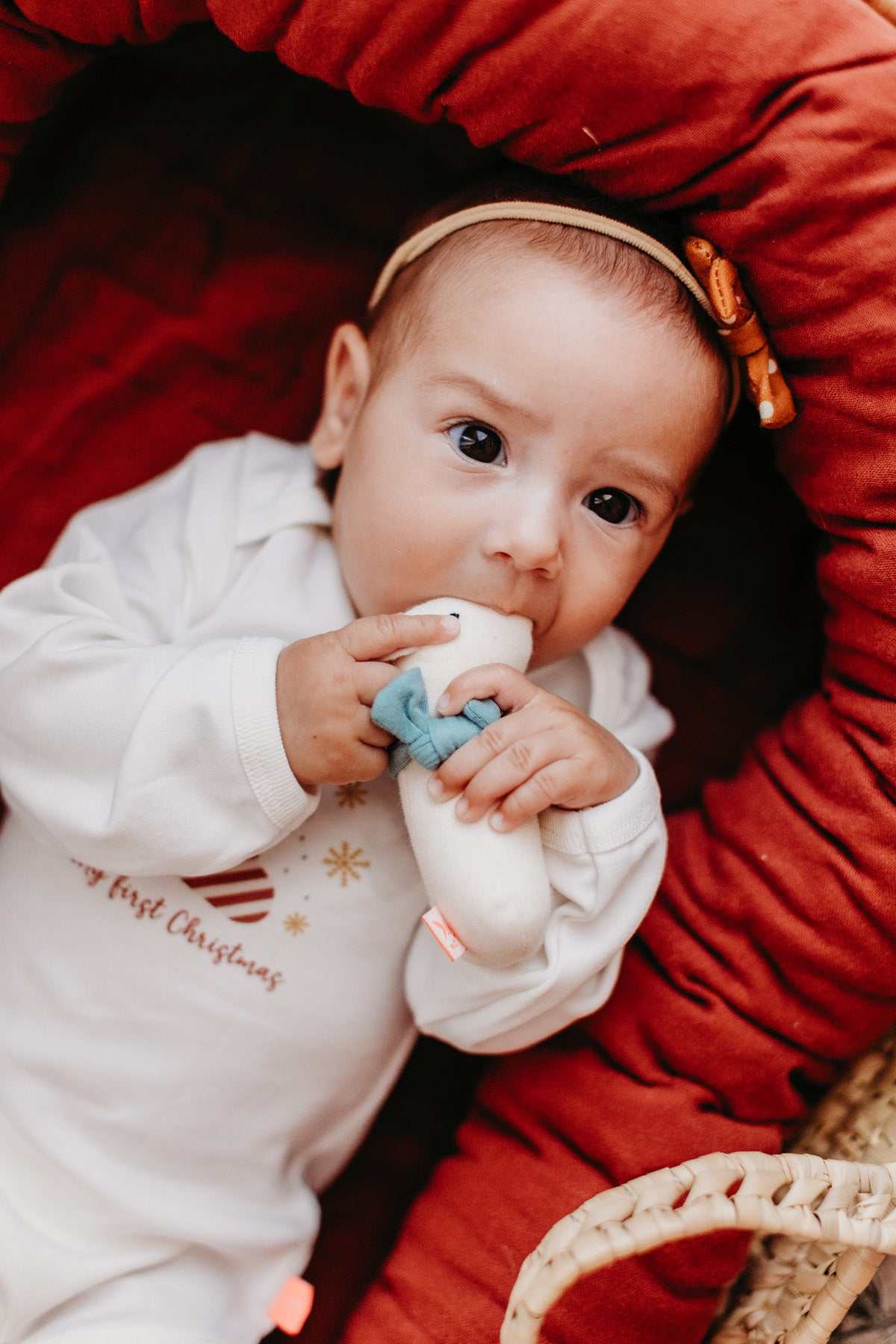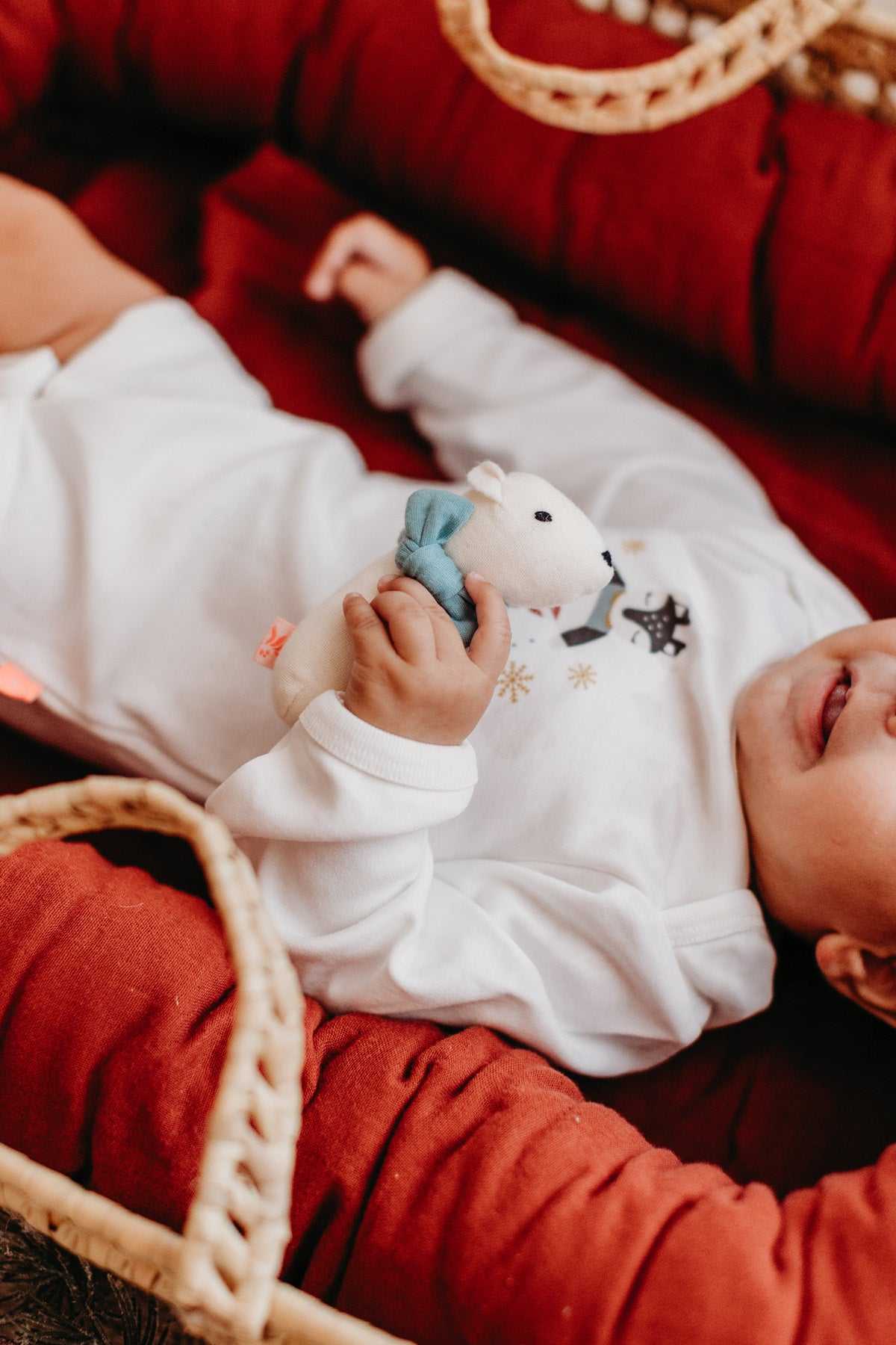 Dieser kleine Spielgefährte findet überall Platz und wird deinem Baby aufgrund seiner handlichen Größe nicht von der Seite weichen. Der niedliche kleine Eisbär eignet sich perfekt als erstes Spielzeug und ist auch ein schönes Geschenk zur Geburt. Durch die kleine Größe und das leichte Gewicht kann sie von Babyhändchen gut gegriffen werden. Im Inneren befindet sich eine Rassel, die sanfte Geräusche macht und das Hörvermögen deines Babys stimuliert. Hergestellt aus 100% Bio-Baumwolle, ist sie sanft zur zarten Babyhaut und umweltfreundlich. Dieser kleine Spielgefährte wird schnell zum Lieblingsspielzeug deines Babys und bringt Freude und Komfort in den Alltag.