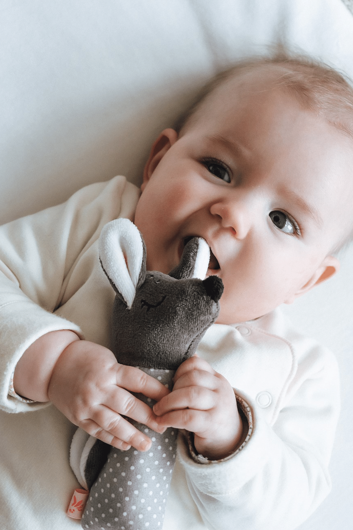 Durch sein geringes Gewicht und die schmale Form kann er ganz einfach von den kleinen Händchen gehalten werden und ist dadurch das perfekte Geschenk zur Geburt.