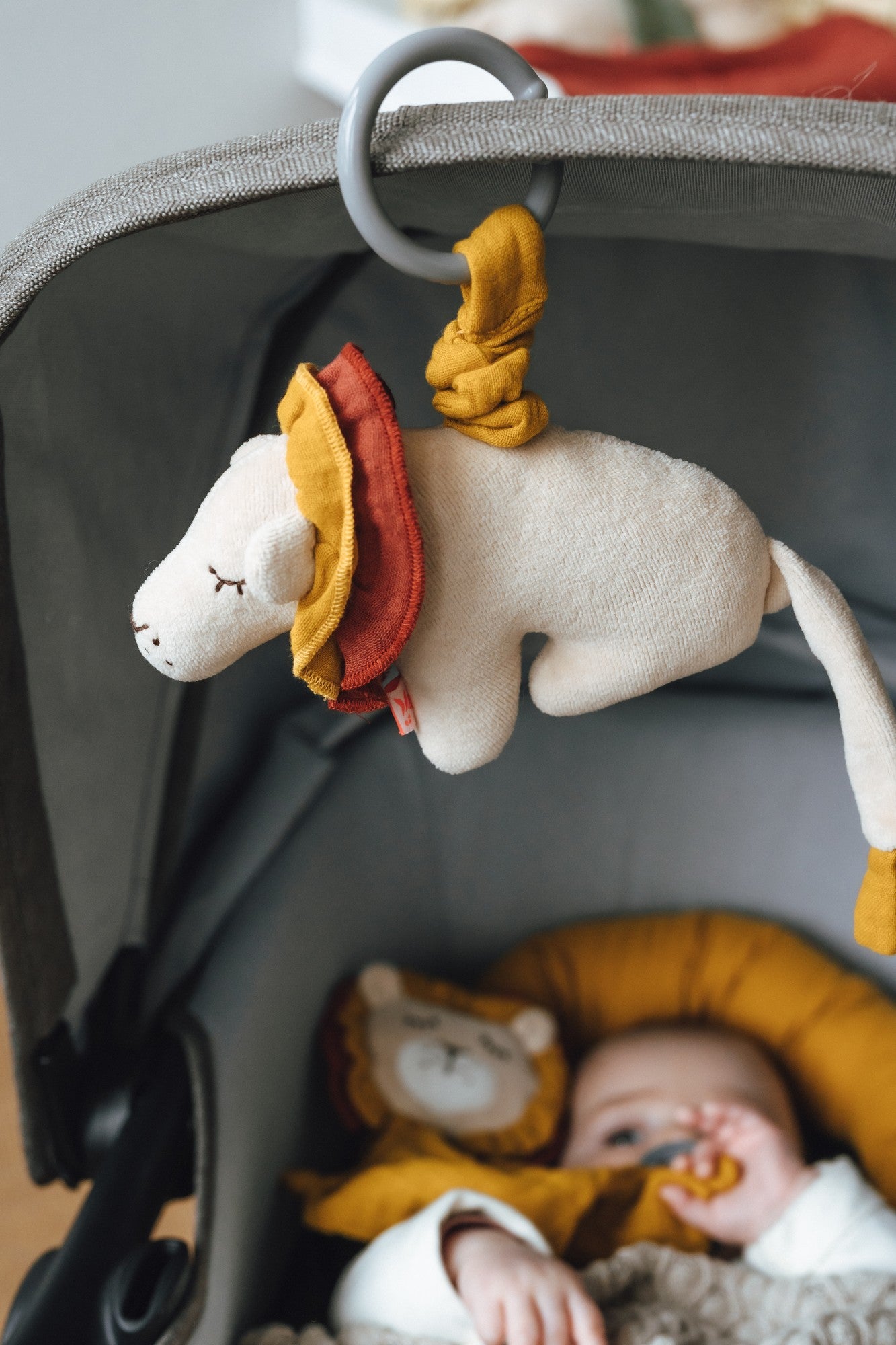 Durch das ziehen an der Schnur, erwacht der kleine Löwe zum Leben. Er ist schnell und einfach am Kinderwagen, am Bett oder am Kinderwagen zu befestigen, somit kann er immer und überall dabei sein.