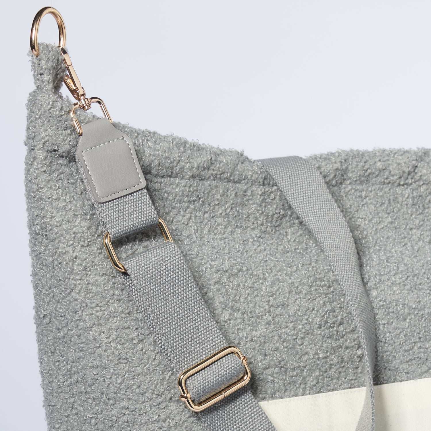 Die Mom Bag ist die neue Must Have Shopper Bag für trendbewusste Mütter, die es praktisch mögen. Sie besteht aus modernem Teddy Bouclé nach Oeko-Tex Standard 100 und ist innen aus robustem, wasserfestem Canva gefertigt. Im Inneren befindet sich eine große Innentasche für Portemonnaie, Handy und Schlüssel. Für zusätzliche Ordnung sorgen die praktischen Gummibänder, an denen Wickelunterlage "to go", Windeln, Fläschchen und Decken befestigt werden können. Das großzügige Volumen der Tasche ermöglicht es, alle weiteren Alltagsgegenstände unterwegs schnell zu verstauen. Der Gurt der Tasche ist rutschfest und mit Karabinerhaken versehen, die am Kinderwagen befestigt werden können. Die Henkel sind längenverstellbar und lassen sich bei Bedarf einfach gegen die trendige, bunte Henkel austauschen. Die Mom Bag ist somit ein Allrounder, halb Shopper, halb Wickeltasche und dein neuer Lieblingsbegleiter. Dank ihrer kuscheligen Beschaffenheit kann Dein Kind sie sogar als Kissen für unterwegs verwenden. Die Mom Bag ist mit 60 x 45 cm perfekt als Shopper Bag und Wickeltasche zugleich. Das Material ist robust und wenig schmutzempfindlich. Flecken lassen sich leicht mit einem Tuch ausreiben. Die Henkel können für den Reinigungsprozeß abgenommen werden. Farbe: grau Größe: 60 x 45 cm Material: 100% Polyester nach Oeko Tex Standard 100 Pflegehinweis: Mit Tuch reinigen. Henkel abnehmbar.