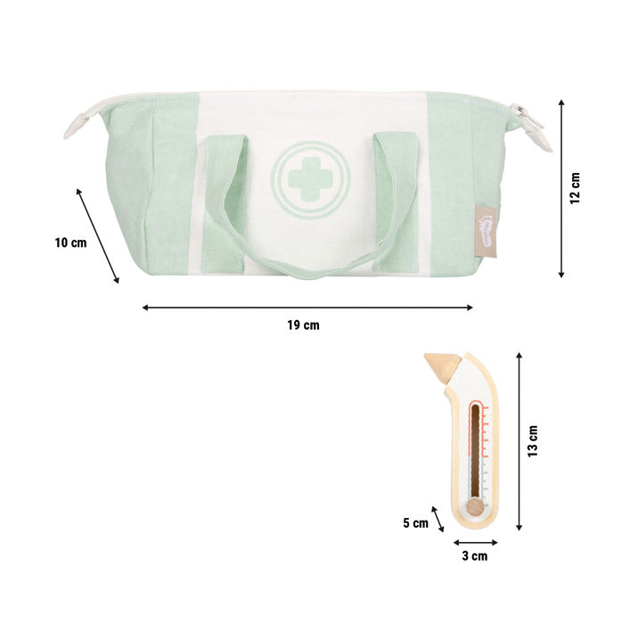 Inhalt: Arzttasche mit Reißverschluss (robust & mobil), Holzspritze mit Rückzugseffekt, Thermometer mit Anzeige, Stethoskop, Spatel, Pinzette, Verband, Beschreibbare Patientenkarte inkl. Folienstift