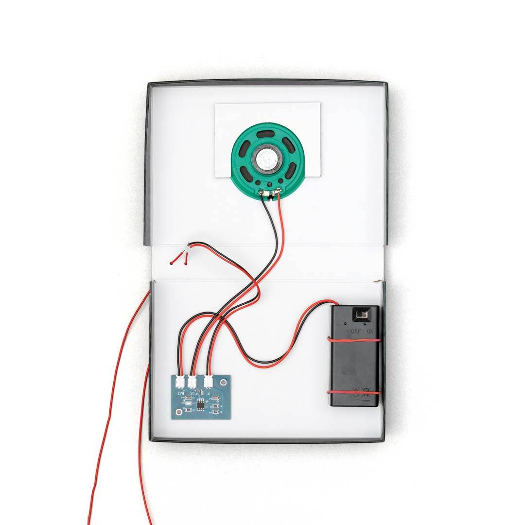 Box-Inhalt: Detektorplatine, Ultraschallsensor, Lautsprecher, Gehäuse, Anleitung (DIN A3-Poster, doppelseitig bedruckt). Zusätzlich erforderlich: 9 V-Blockbatterie, Gummiband.