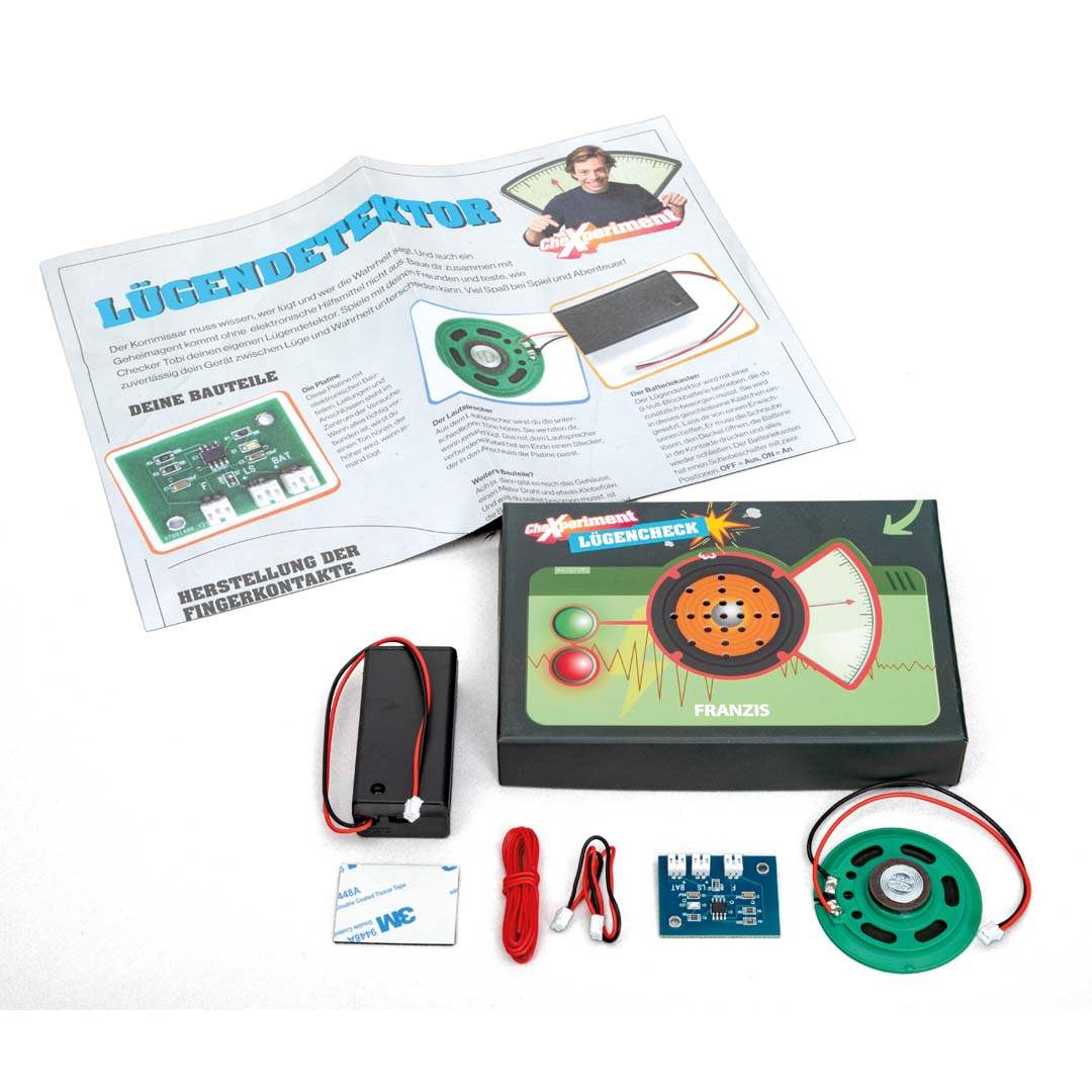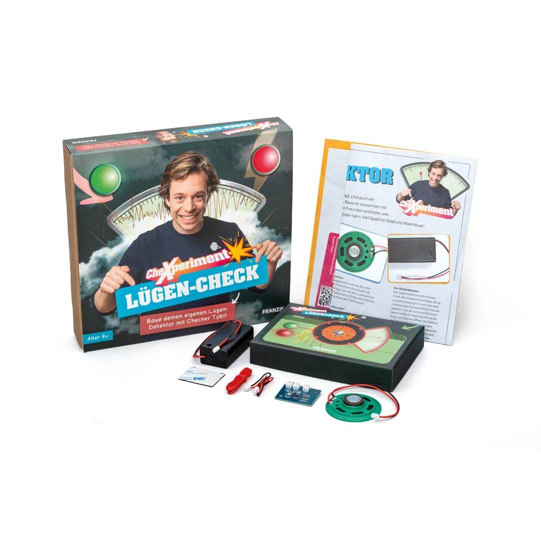 Werde zum Checker-Detektiv – mit deinem eigenen Lügendetektor! Dieser coole Bausatz für Kinder macht’s möglich: Baue zusammen mit Checker Tobi einen echten Lügendetektor, der anhand kleiner Veränderungen herausfinden kann, ob jemand die Wahrheit sagt. Mit der einfachen und verständlichen Anleitung gelingt dir der Aufbau im Handumdrehen – und das Abenteuer kann beginnen!