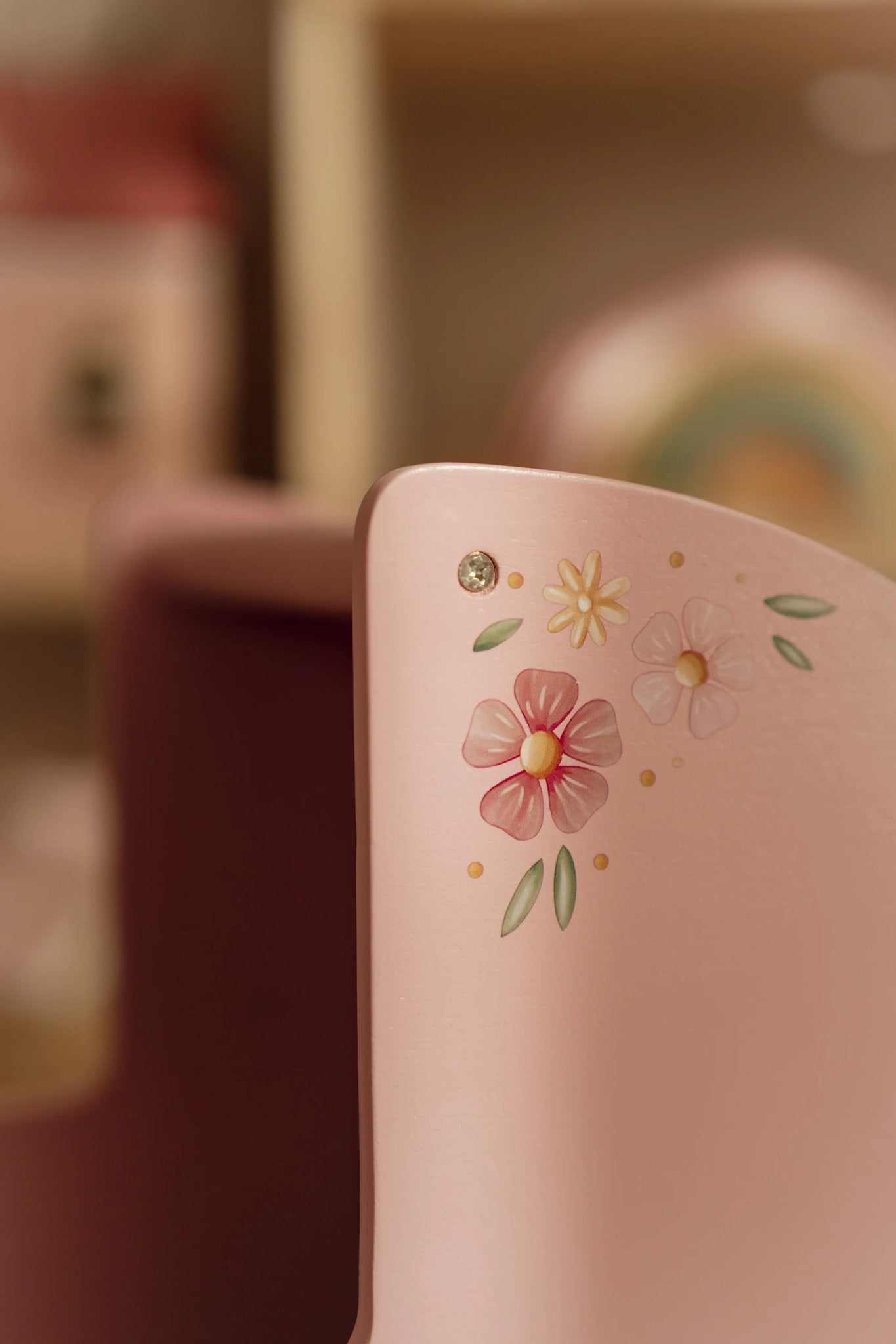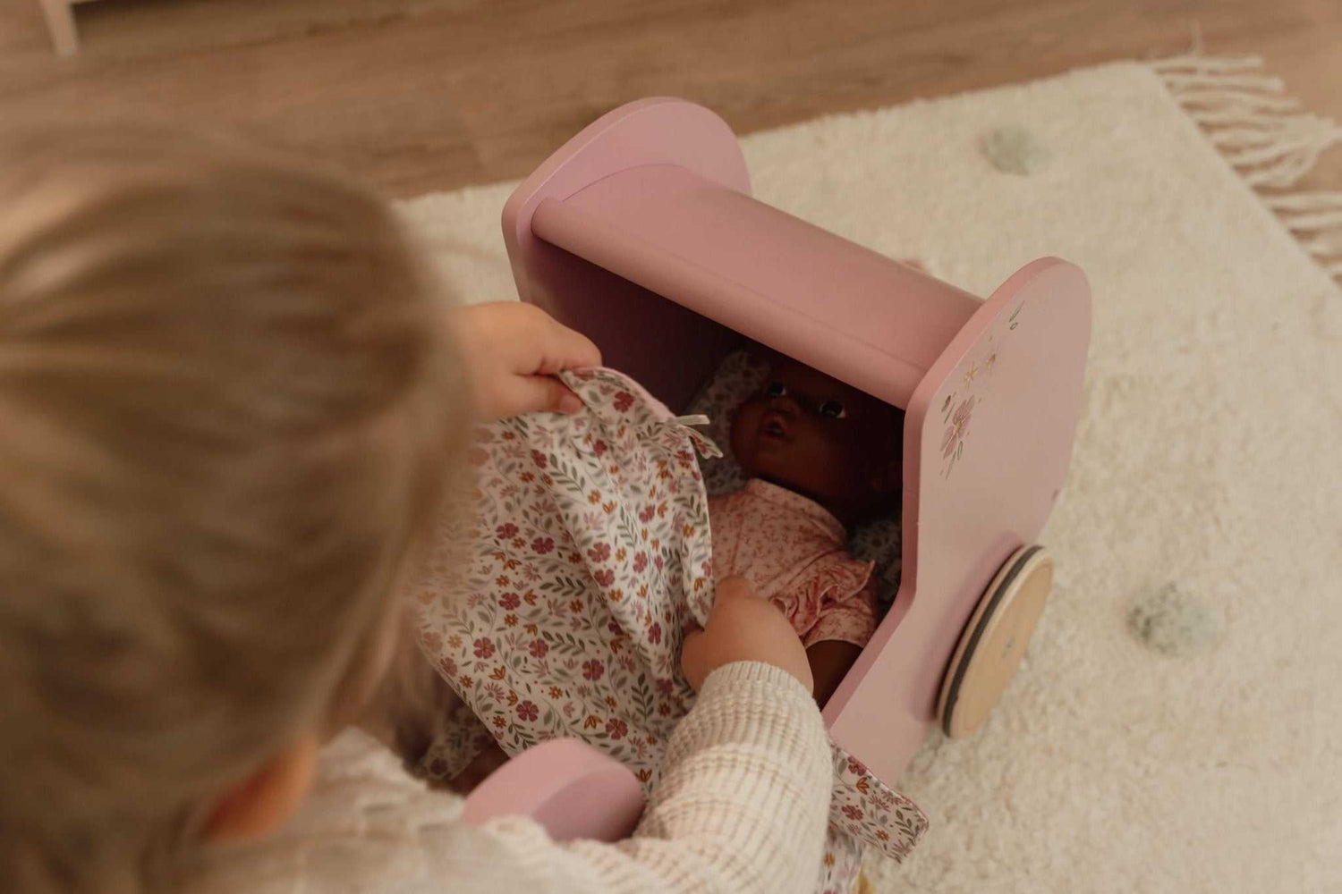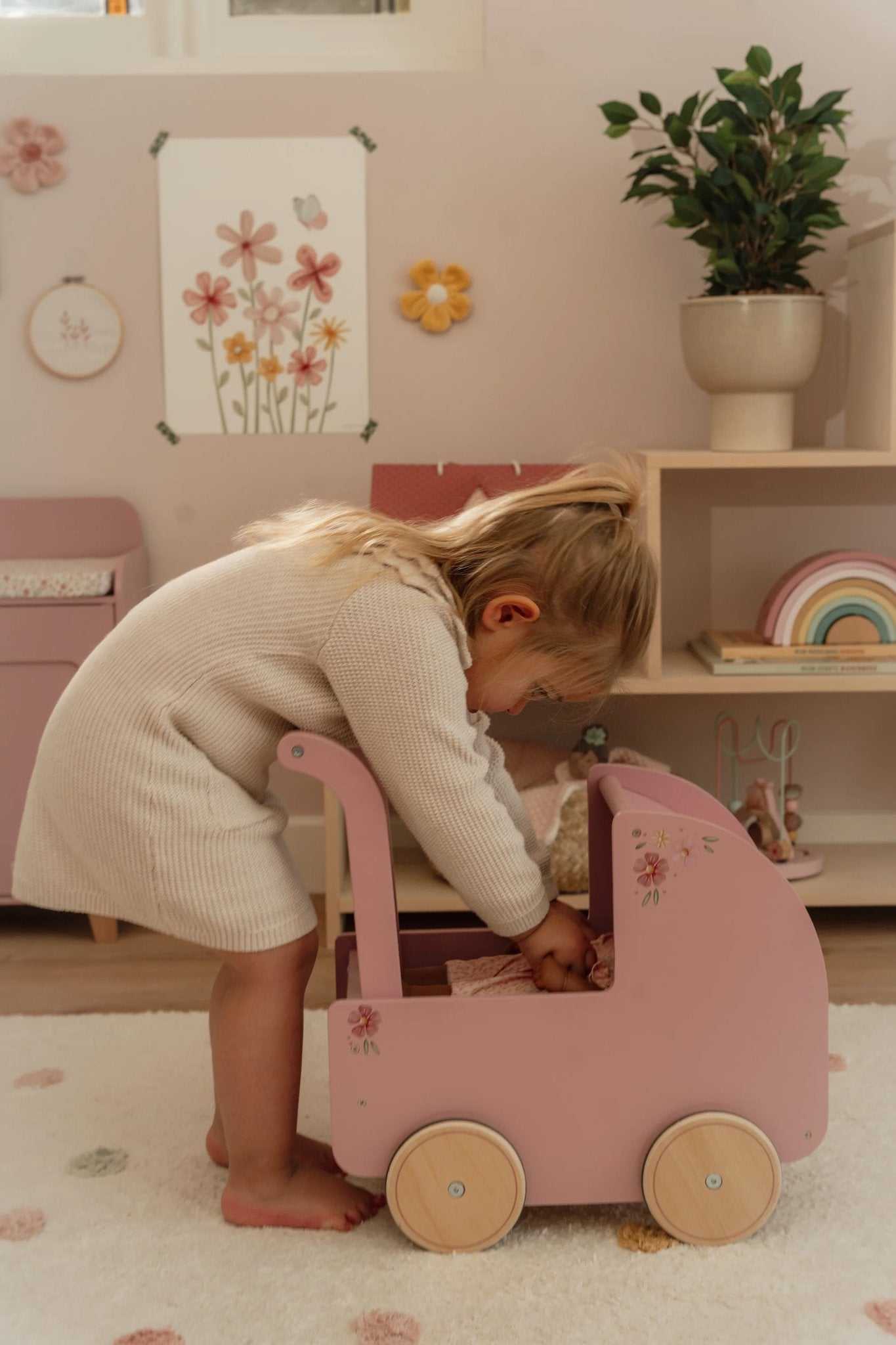 Der Holz Puppenwagen von Little Dutch ist ein wunderschönes Spielzeug mit nostalgischem Design und einer eleganten Blumenillustration.