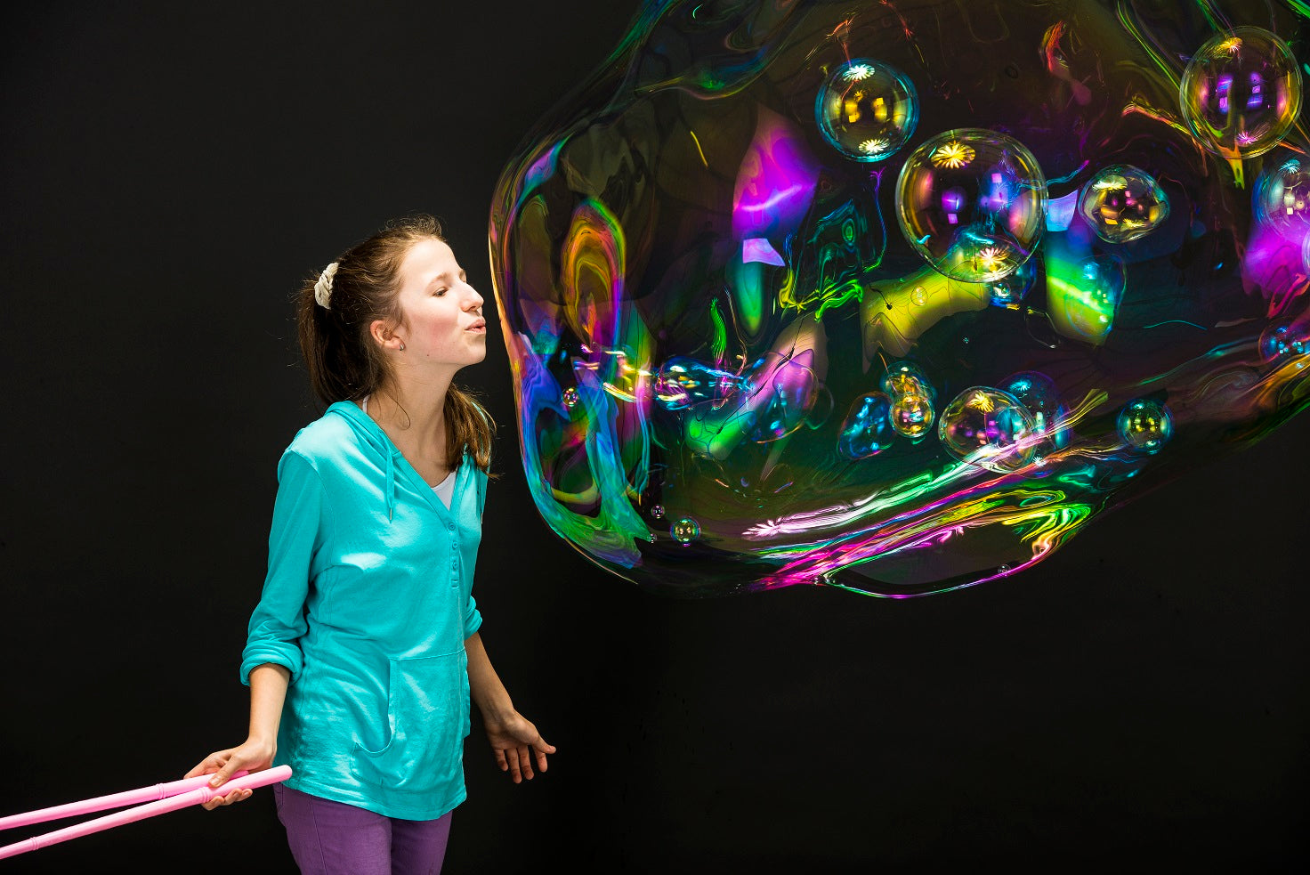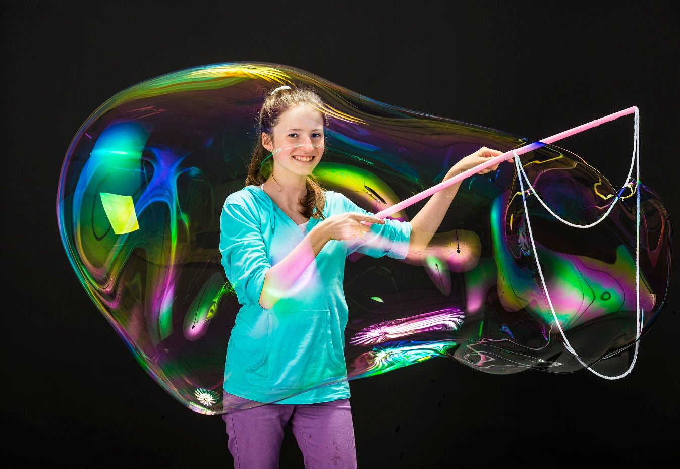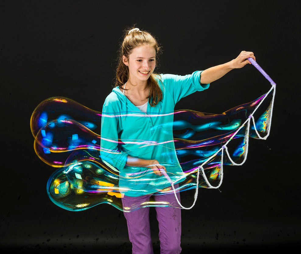 Die Schnur wird vollständig in die Seifenblasen- Flüssigkeit eingetaucht, dann werden die Stäbe langsam auseinander gezogen und schon können die Jumboblasen auf Reise geschickt werden.