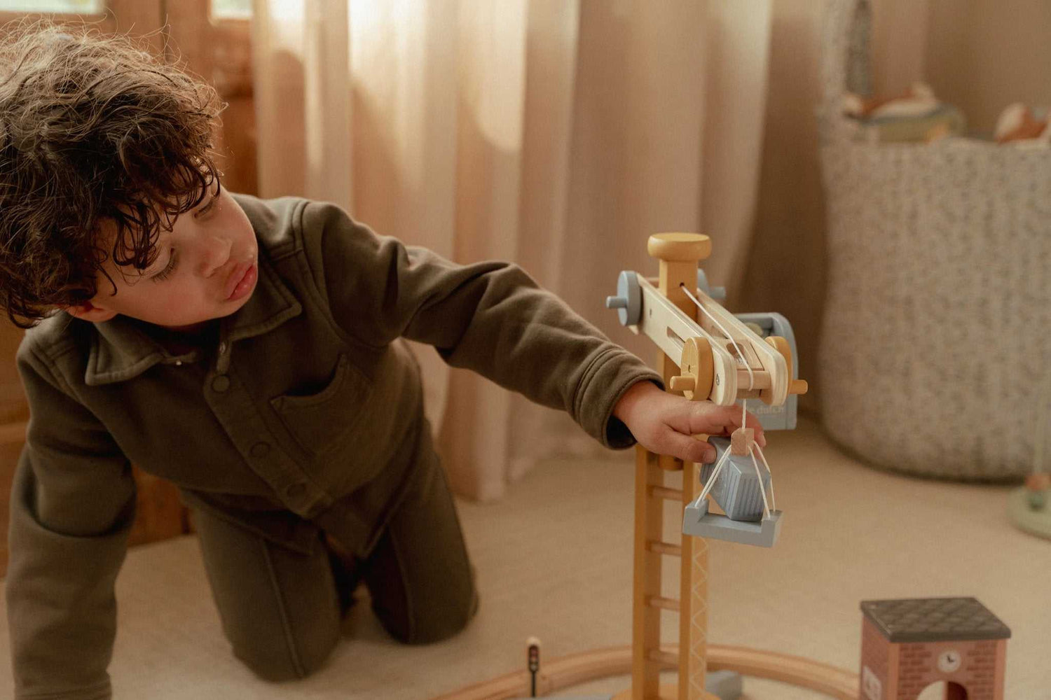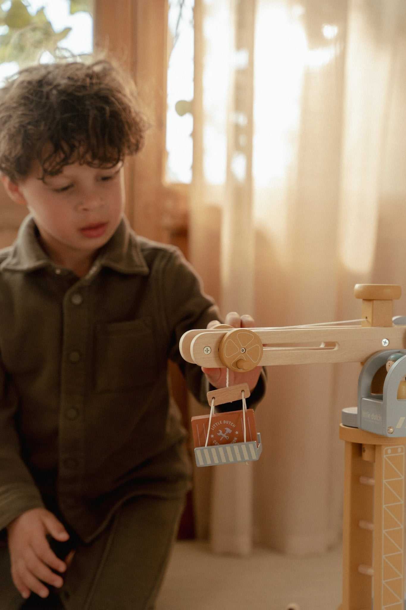 Das Kran-Set von Little Dutch ist ein hochwertiges Holzspielzeug, das Kindern ab einem Mindestalter von 3 Jahren stundenlangen Spielspaß bietet.