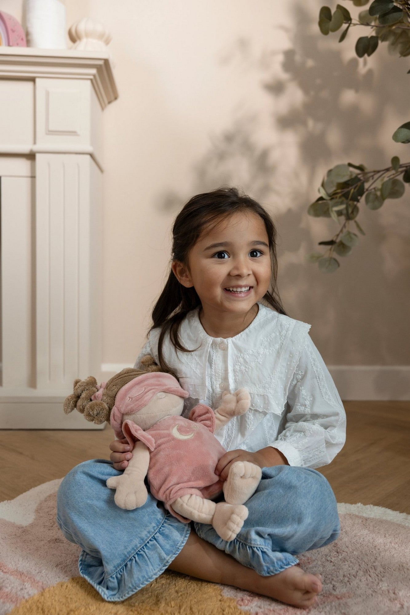 Lerne Rosa kennen, das weiche Schlaf-Freundchen für dein Kleines. Mit ihrem lieben Gesicht, dem kuschelweichen Körper und dem niedlichen Schlafsack mit Mond- und Sternenmuster bringt sie Ruhe und Geborgenheit. Ihr Strampler und Schlafsack können an- und ausgezogen werden, für extra Spielspaß. Rosa ist immer bereit für eine Kuscheleinheit und ein schönes Schläfchen zusammen.