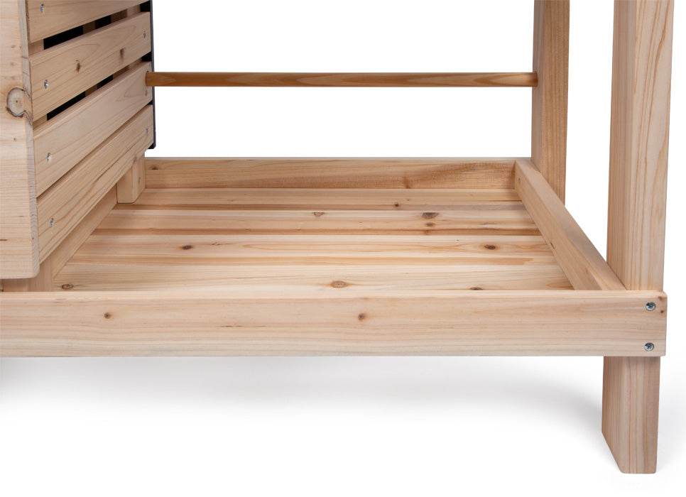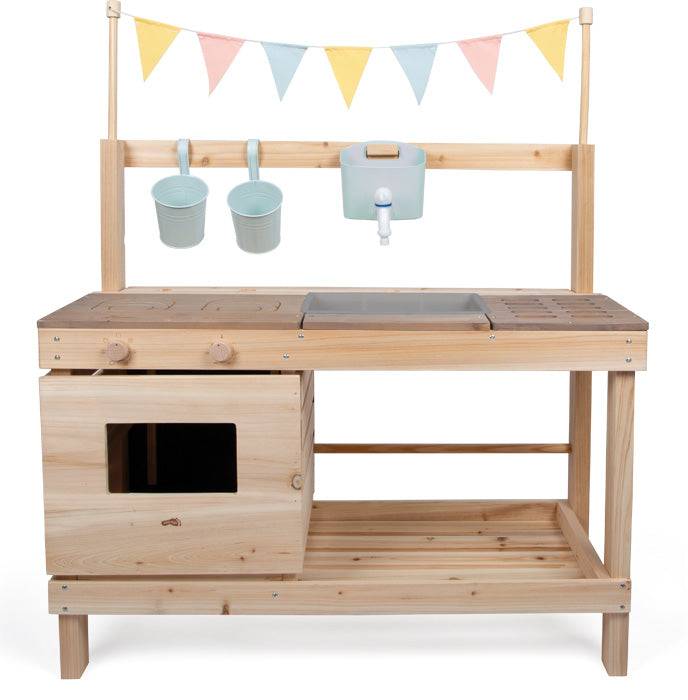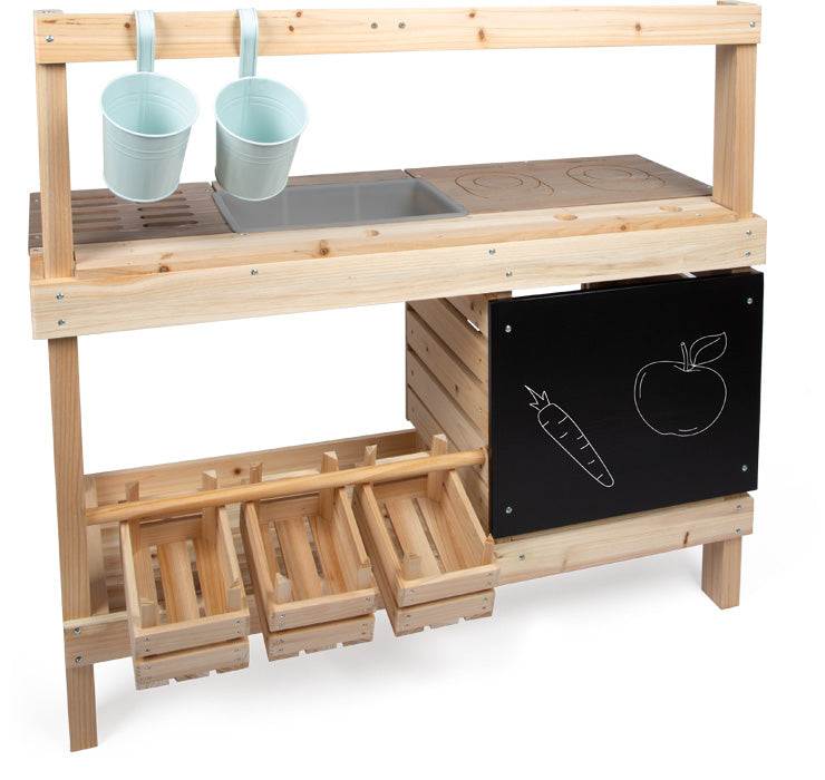 Gefertigt aus robusten Materialien, ist die Outdoor-Küche für ausgiebige Spielstunden konzipiert. Für eine besonders lange Lebensdauer empfiehlt es sich, das unbehandelte Holz mit einer geeigneten Holzschutzlasur zu behandeln. So bleibt die Freude an diesem vielseitigen Spielmöbel über viele Saisons hinweg erhalten.