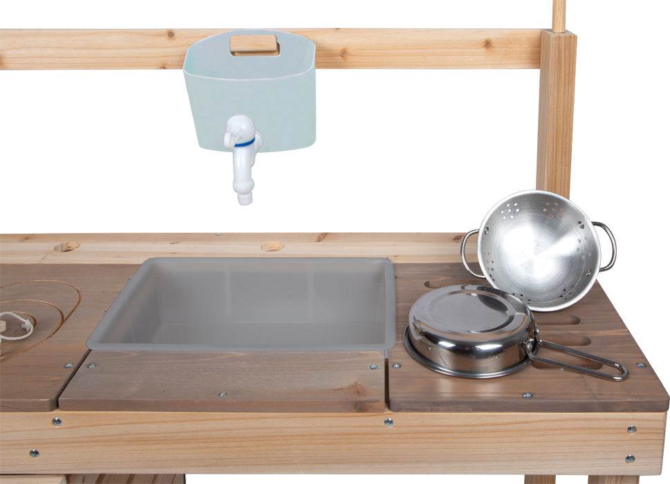 Ein Backofen mit Drehknebeln und einschiebbarem Backblech, ein Kochfeld mit eingravierten Bediensymbolen und Kochplatten mit Touchbedienung sowie ein Waschbecken mit Wasserspender und Wasserhahn bilden die Highlights dieses Multitalents. Ergänzt werden diese durch eine Grillzone, 3 Holzkisten, Hängetöpfe, Ablageflächen, umfangreiches Metall-Kochgeschirr und Küchenhelfer plus eine stimmungsvolle Wimpelkette, die diese besondere Spielküche zum Blickfang in jedem Garten macht. Eine beschreibbare Tafel, seitliche Haken, Aufbewahrungs- und Stauraum sowie die farblich abgesetzte Arbeitsplatte runden die Gartenspielküche perfekt ab. Mit Aussparungen zur Aufbewahrung von Spielutensilien.