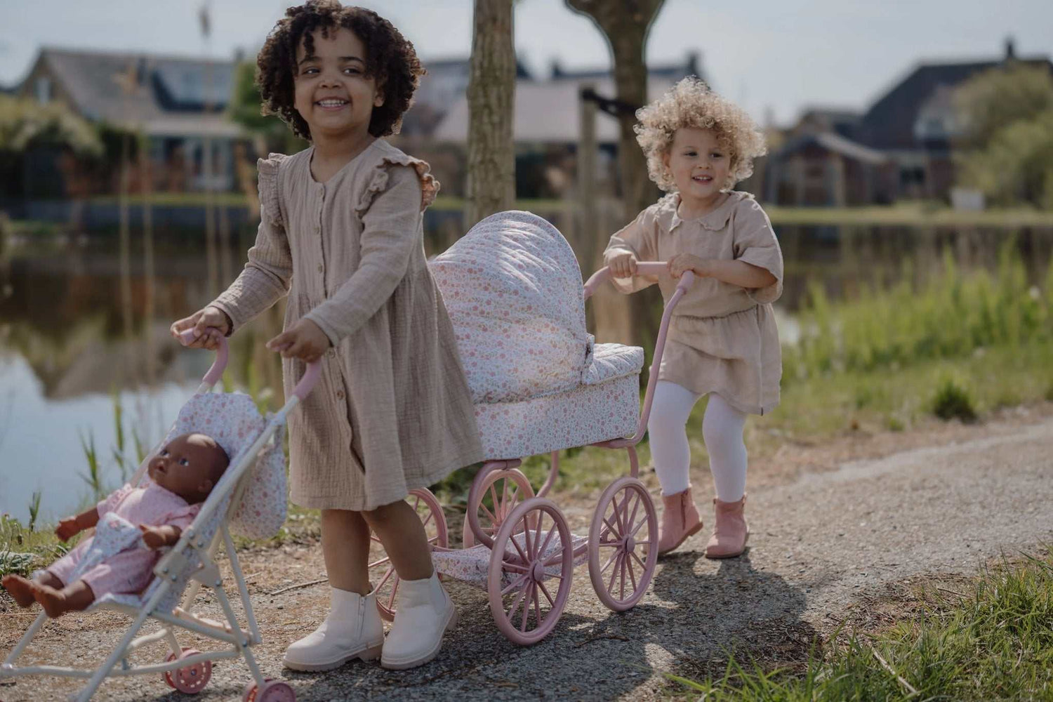 Der Metallpuppenwagen "Soft Flowers" von Little Dutch ist ein robustes und stilvolles Spielzeug, das Kindern ab 3 Jahren stundenlangen Spielspaß bietet.