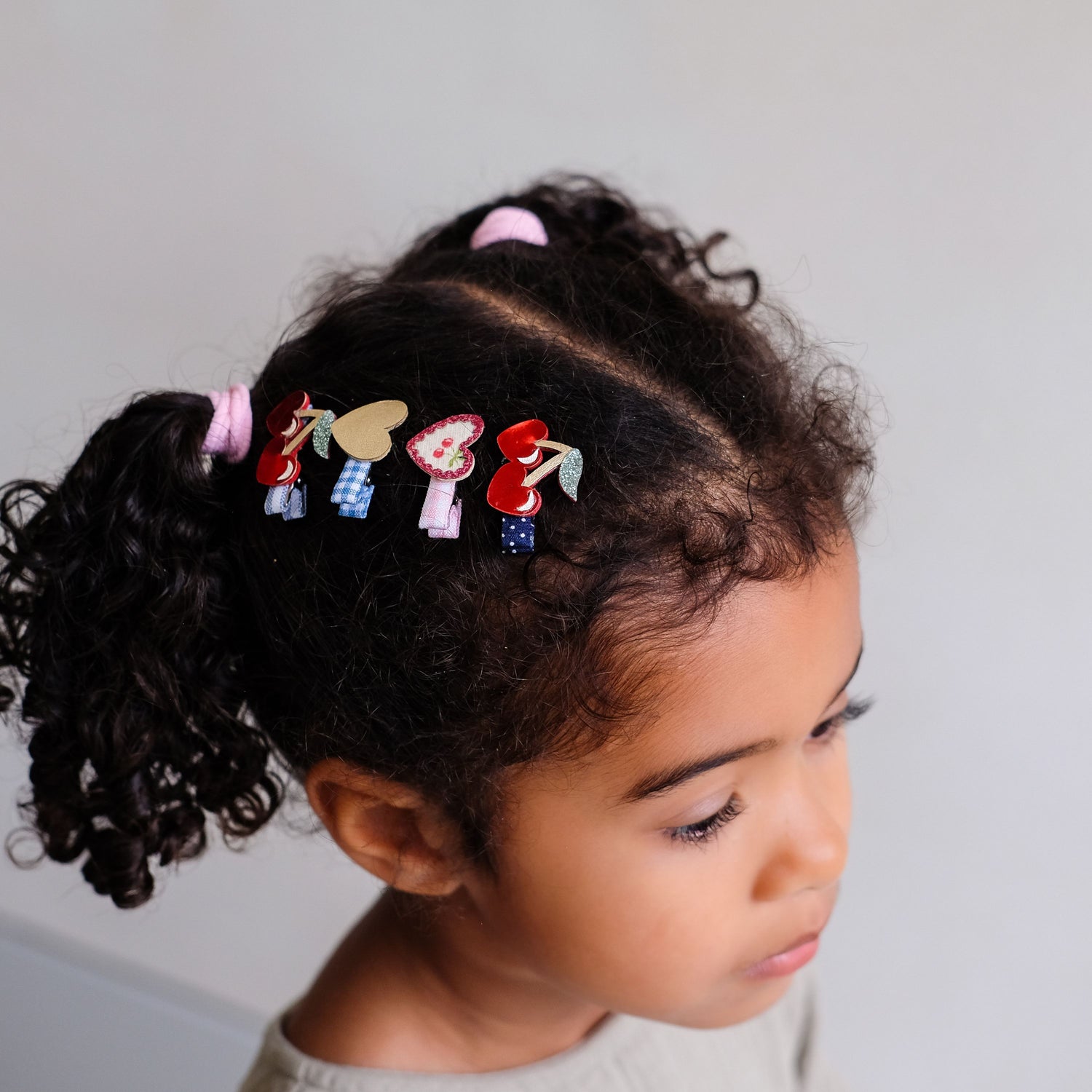 Die Cherry Mini Clips von Mimi & Lula setzen fröhliche Akzente in jedem Haar. Leuchtend rote Kirschen und fröhliche Herzchen aus Glitzer-, Metallic- und Kirschstoff sorgen für einen verspielten Look – ideal für Spielnachmittage, Geburtstagsfeiern oder einfach, um jeden Tag ein bisschen süßer zu machen.