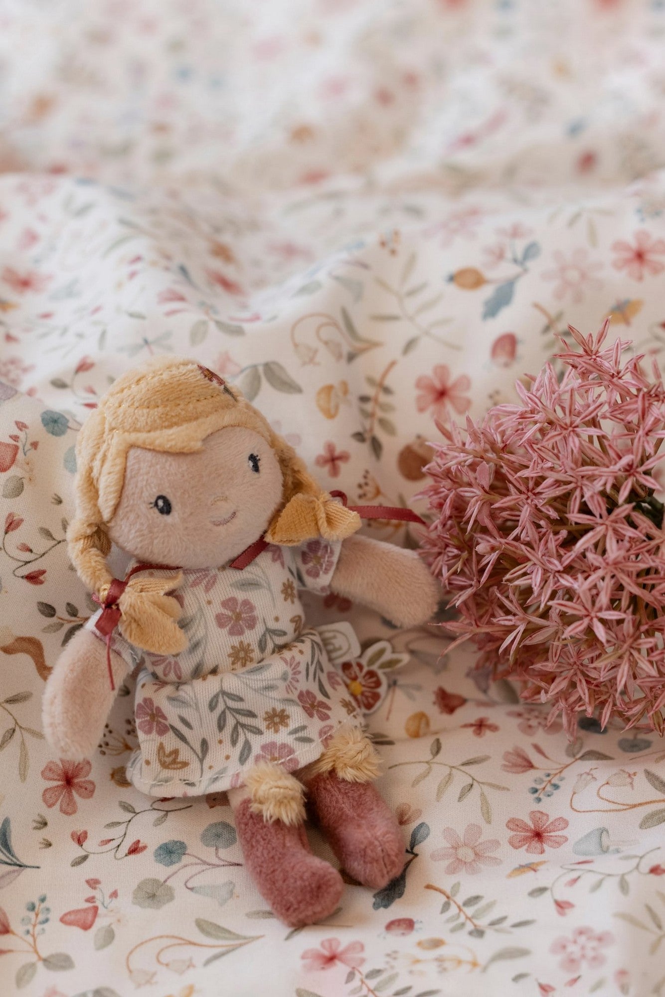 Lerne die Mini Kuschelpuppe Julia kennen, ein süßes Püppchen mit niedlichen Zöpfen und einer Blume im Haar. Julia trägt ein fröhliches Blumenkleid und weiche Stiefelchen mit einem Pompon. Sie ist 10 cm groß und kommt in einer schönen Schachtel mit Kordel. Perfekt, um sie überallhin mitzunehmen und gemeinsam die schönsten Abenteuer zu erleben. Hergestellt aus herrlich weichem Material für endlosen Kuschelspaß. Artikel: LD4682 Größe: 10 cm Geeignet: ab Geburt