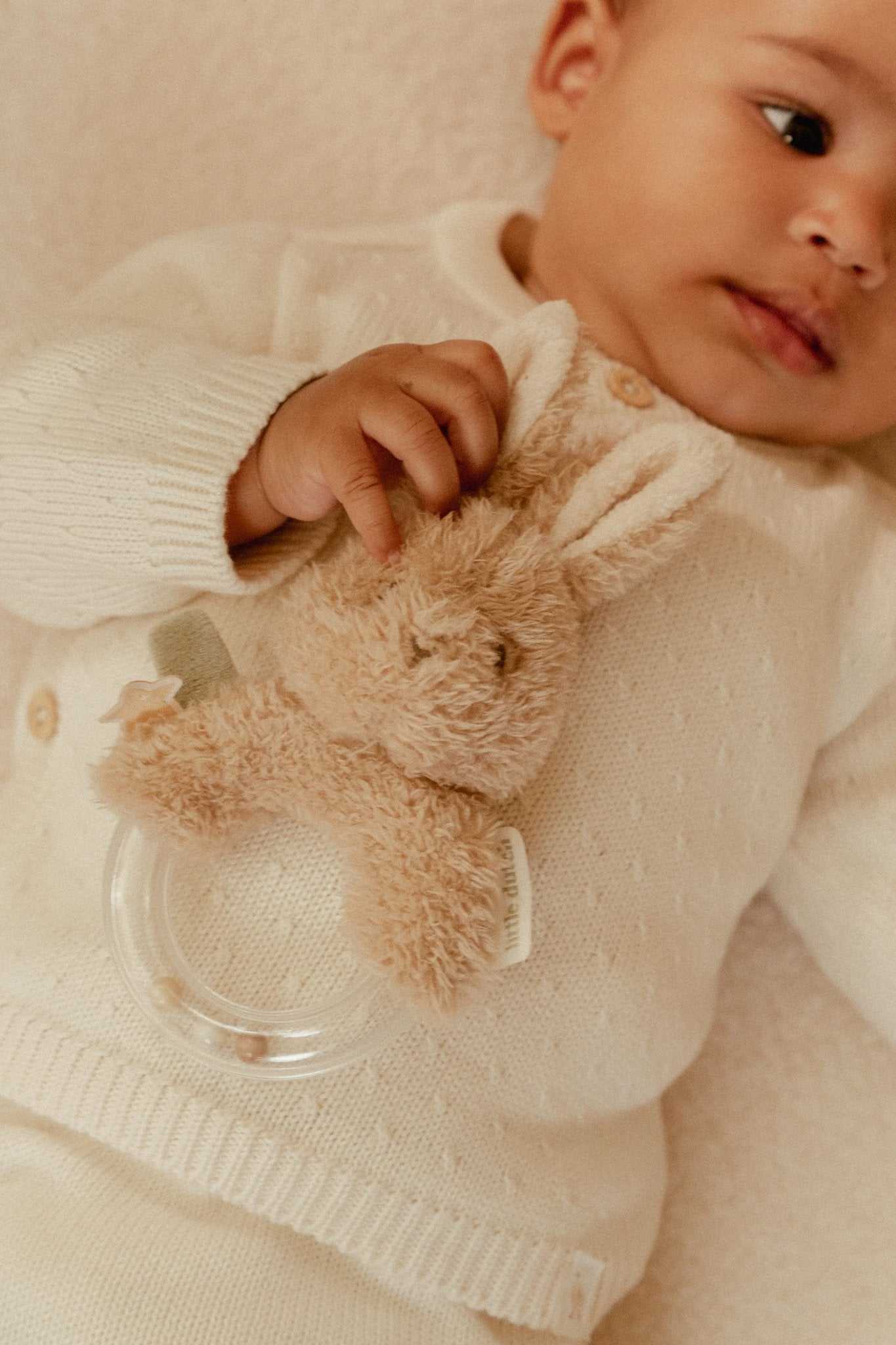 Die Ringrassel ist in einer dezenten beige Farbe gehalten und besteht zu 100% aus Polyester. Sie kann per Hand gewaschen werden, um sie sauber zu halten. Die Altersempfehlung für dieses Spielzeug beträgt 0+ Monate.