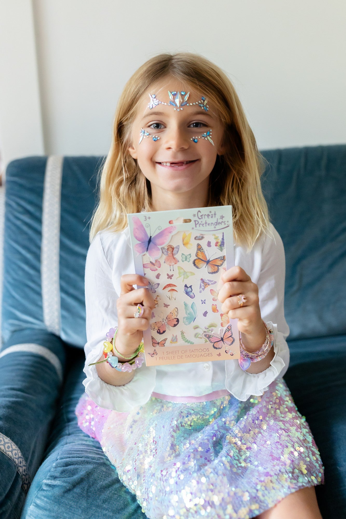 Kinder lieben Tattoos! Mit diesen Tattoos von Great Pretenders kann Ihr Kind seine Verkleidung ergänzen. Die zauberhaften Schmetterlinge sehen auf der Haut besonders gut aus. Modell: 97472 Lieferumfang: 1 Verpackung mit 18 Tattoos Über Great Pretenders: Die kanadische Mutter Joyce Keelan war auf der Suche nach fantasievollen Spielsachen für ihre Kinder. Ihr fehlte vor allem ein Angebot an schönen und lustigen Kostümen, damit ihre Kinder in Rollenspielen ihre Fantasie ausleben konnten. Im Rollenspiel stärken Kinder ihr Selbstvertrauen, regen ihre Kreativität an und entwickeln ihr eigenes Weltbild. Joyce Keelan startete ihre Reise und alles, was ihr fehlte, kreierte sie selbst. Dabei entstanden schöne Spielzeuge, fantasievolle Kostüme und passende edle Accessoires. Dafür gewann Joyce Keelan viele Preise und Auszeichnungen. Das erfolgreiche Unternehmen Great Pretenders war geboren. Die kanadische Marke legt sehr viel Wert auf die Qualität ihrer Produkte: Sorgfältig ausgewählte Stoffe und clevere Accessoires garantieren viel Spaß am Spiel und ermöglichen den Kindern in eine Fantasiewelt einzutauchen.