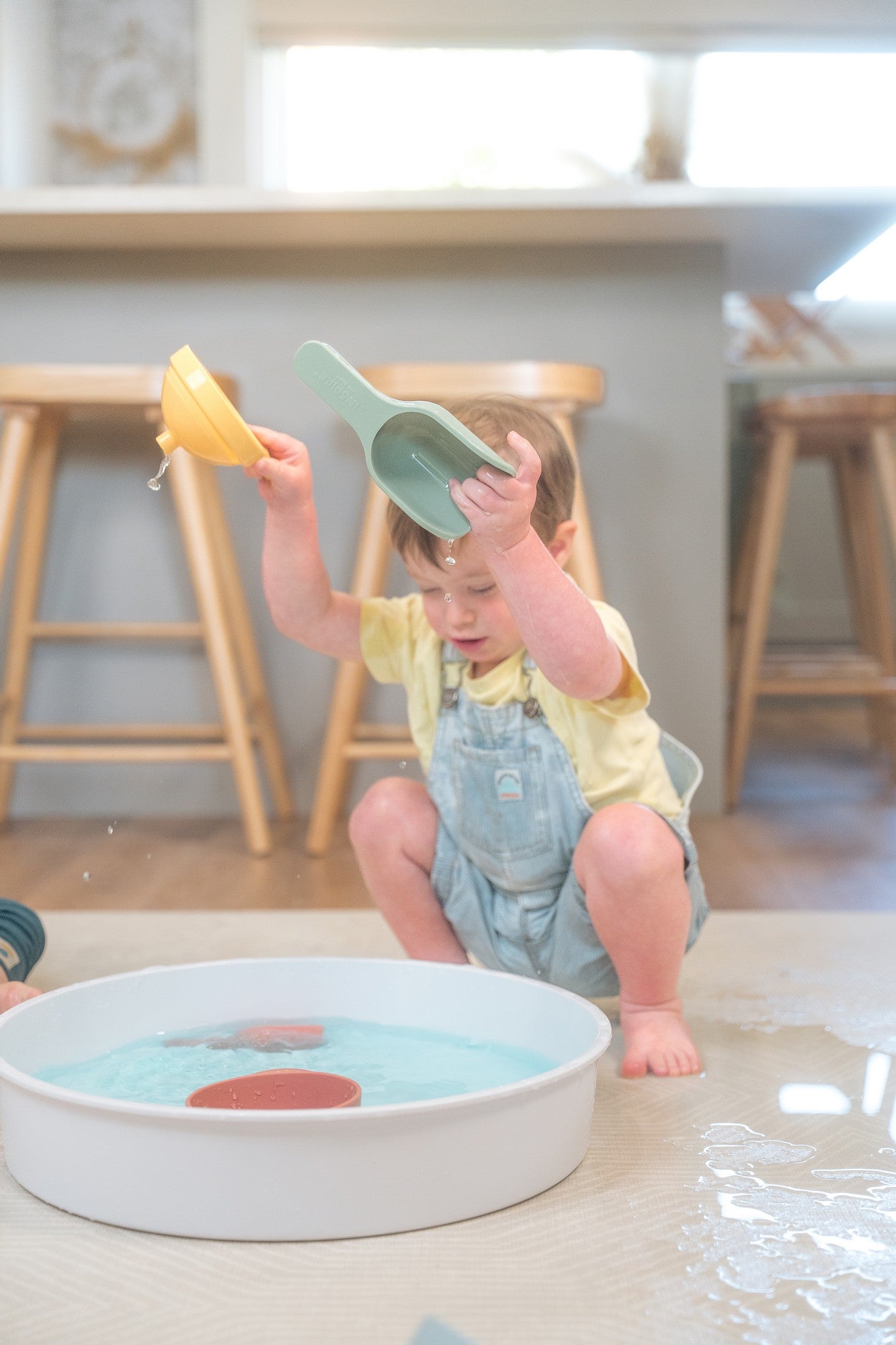 Besonders praktisch ist der Trichter im Griff des großen Schaufels, der es dem Kind ermöglicht, verschiedene Materialien wie Wasser, Sand oder Erbsen zu gießen und zu beobachten, wie sie hindurchfließen. Die Schaufeln können sowohl in der Badewanne als auch im Sandkasten verwendet werden und eignen sich ideal für die Verwendung mit einem Play TRAY-Sensoriktablett.
