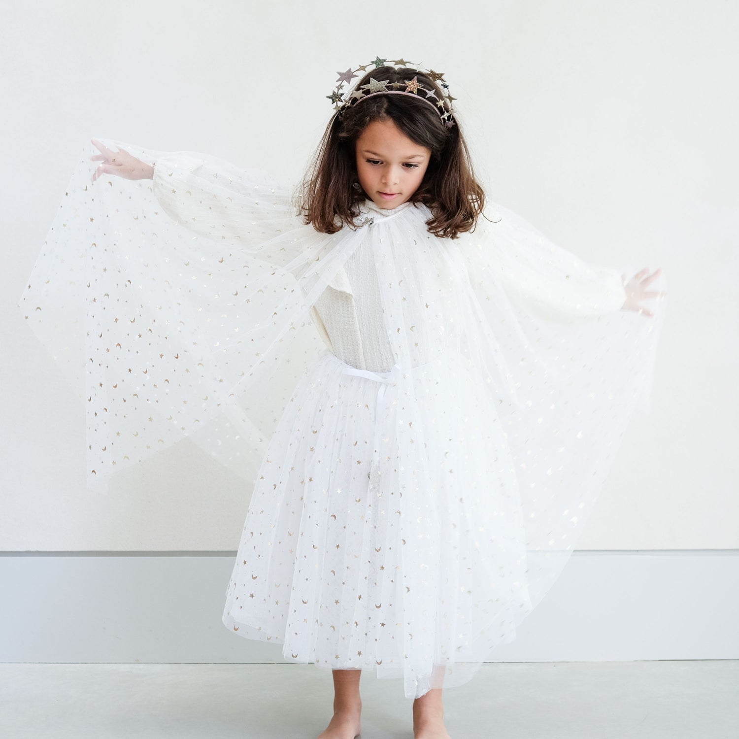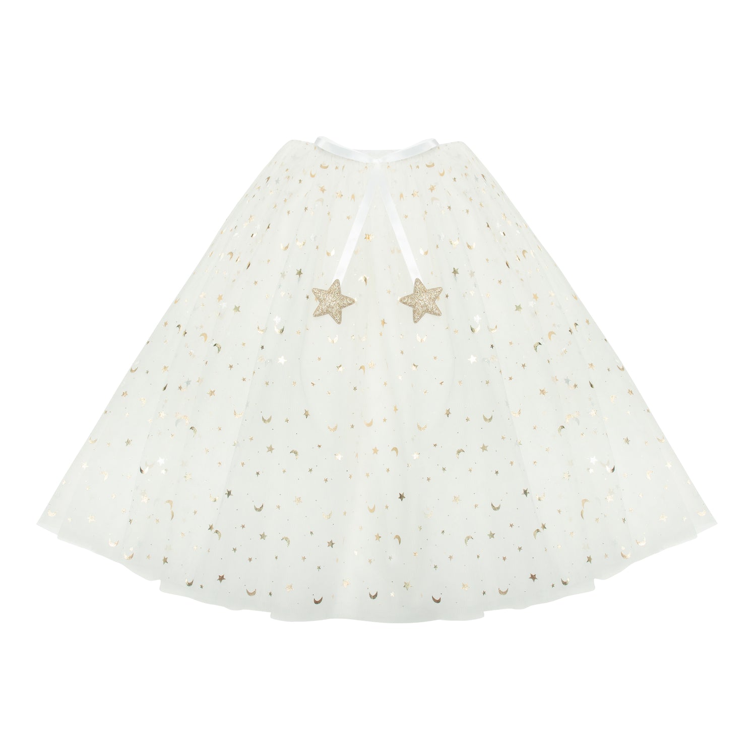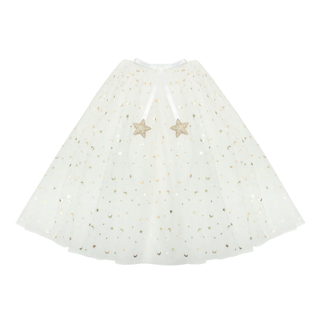Das Tutu von Mimi & Lula besteht aus mehreren Schichten wunderschönen weißen Tülls, der mit metallisch-goldenen Monden und Sternen verziert ist.