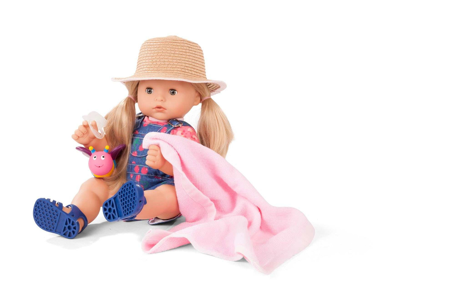 Im Lieferumfang enthalten sind: Puppe, Sommeroutfit, Sandalen, Handtuch, Schnuller, Strohhut und ein Wasserspielzeug