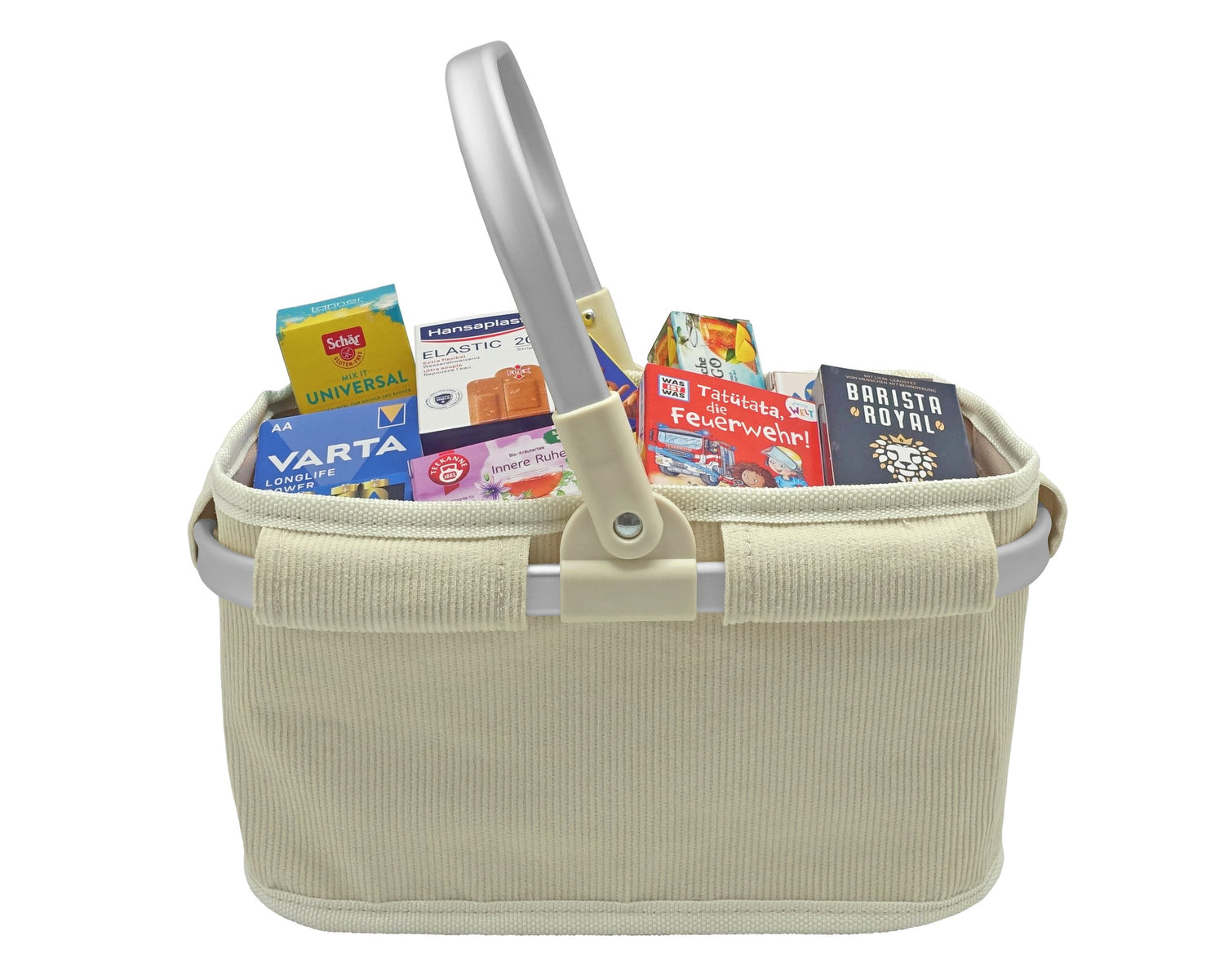 Einkaufen wie die Großen! Dieser praktische Tragekorb von Tanner aus stylishem Cordstoff in Beige bringt Ordnung, Stil und jede Menge Spielspaß in den Kinderkaufladen. Im Inneren befinden sich zahlreiche Miniatur-Faltschachteln bekannter Marken, liebevoll gestaltet und im authentischen Look echter Produktverpackungen – perfekt für realistische Rollenspiele rund ums Einkaufen.