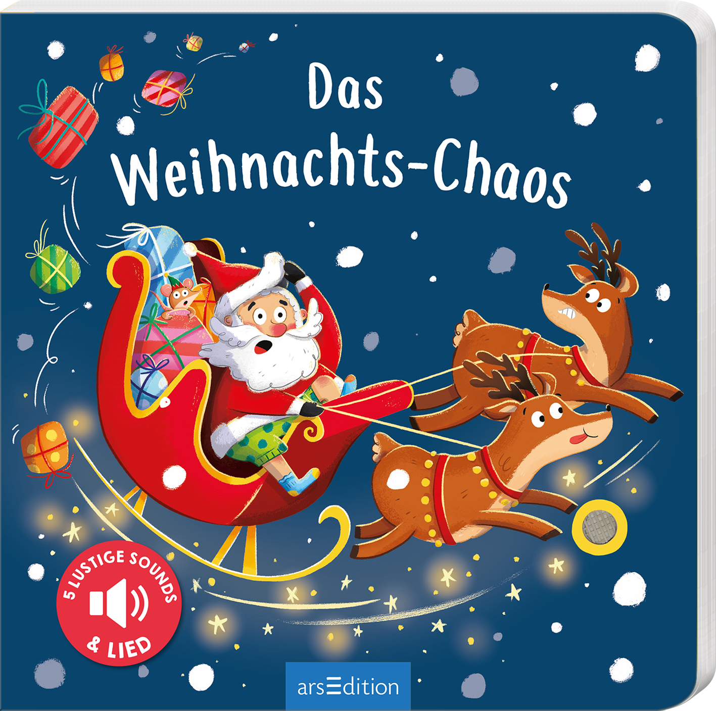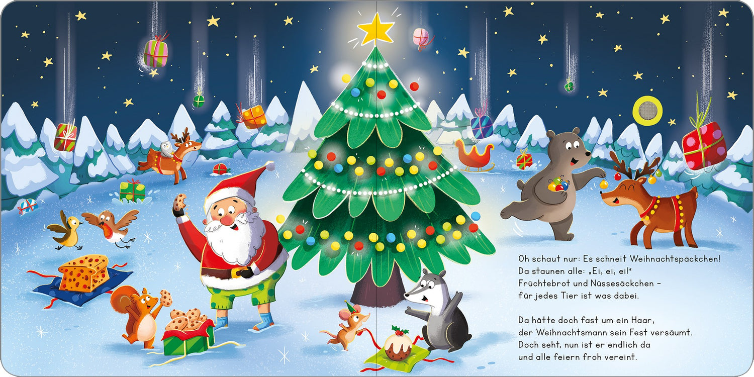 In diesem kunterbunten Pappbilderbuch wird eine lustige Geschichte rund um den Weihnachtsmann erzählt, der fast das Weihnachtfest verschläft. Die perfekte Kombination aus witzig gereimter Geschichte, abwechslungsreichen Sounds und einem tollen Weihnachtslied. Beim Drücken auf die Soundpunkte werden insgesamt fünf Geräusche ausgelöst. Den Abschluss bildet ein Gutenachtlied zum Anhören, Mitsingen und Träumen. So werden die Adventszeit und Heilig Abend für jedes Kind zu einem absoluten Highlight! Das liebevoll gestaltete Soundbuch eignet sich für Kleinkinder ab 18 Monaten.