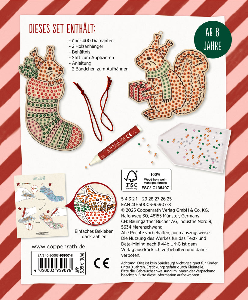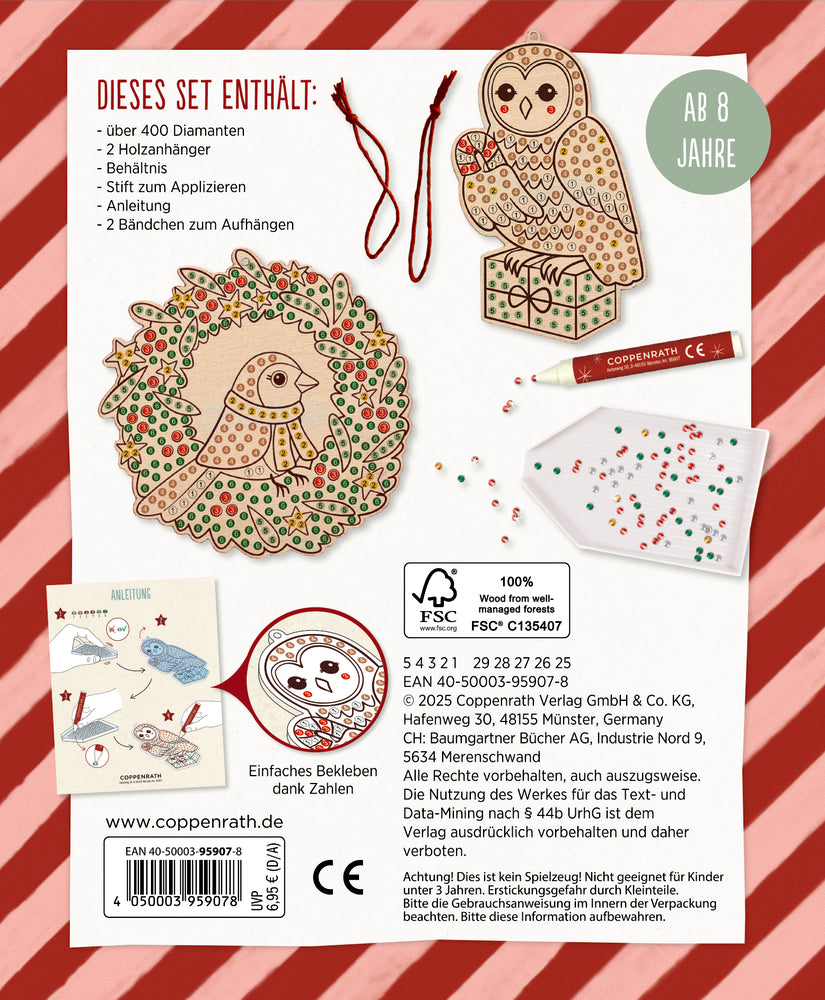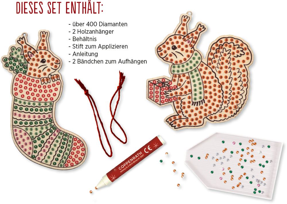 Inhalt: 2 Holzanhänger, Dekosteine (Diamonds), 1 Stift zum Applizieren, 1 Behältnis, 1 Anleitung