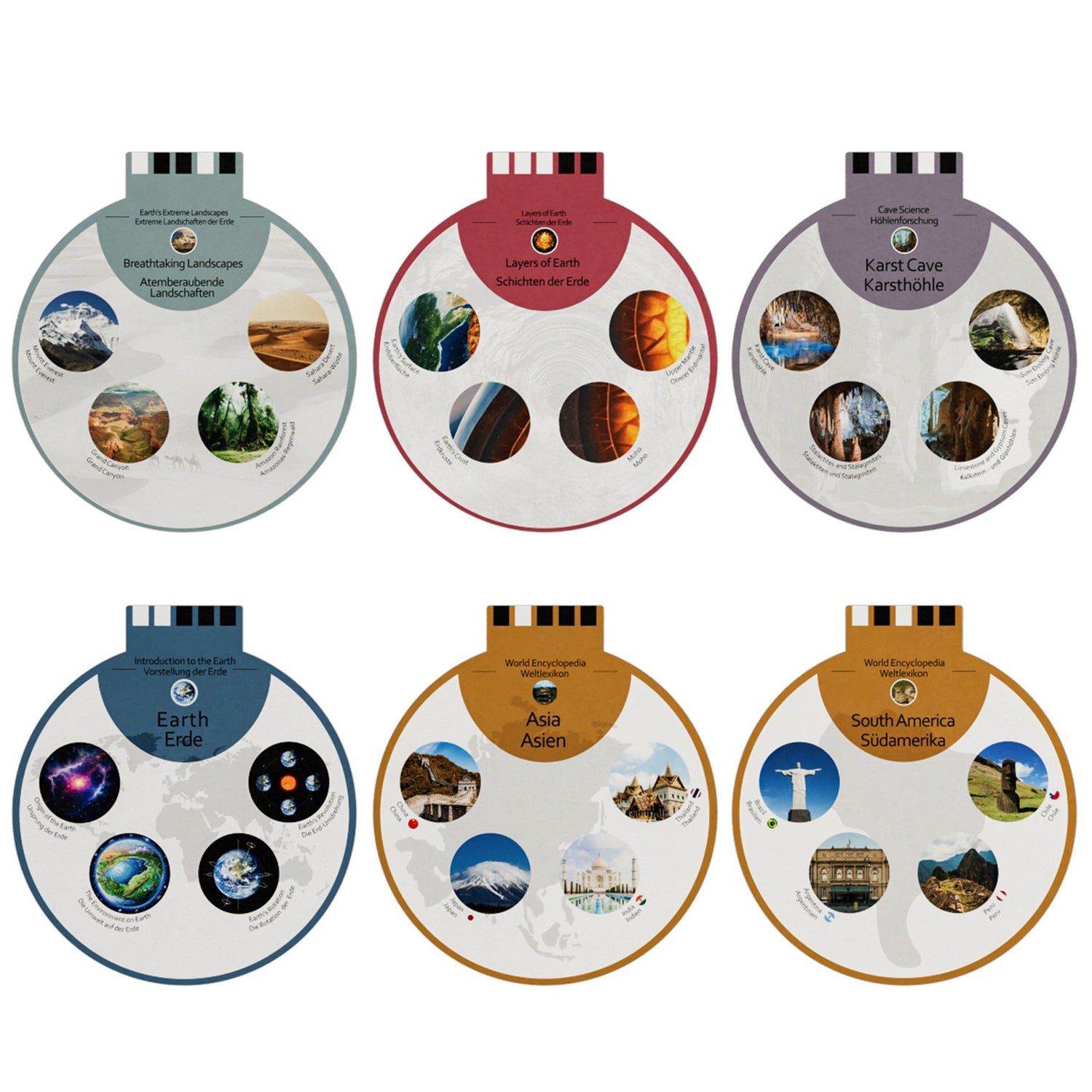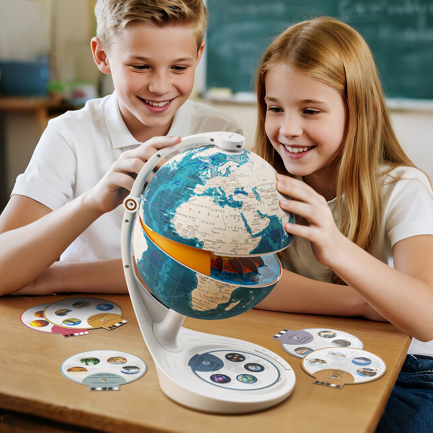 Lieferumfang:1 Globus mit interaktiver Basis, 2 herausnehmbare Erdschichten, 6 große, doppelseitige Wissenskarten, 6 kleine Wissenskarten
